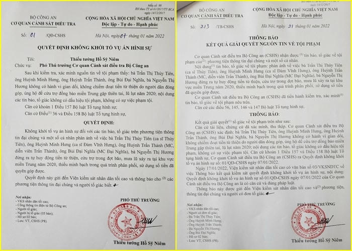 Theo nội dung thông báo, căn cứ tài liệu, chứng cứ đã xác minh, thu thập, Cơ quan Cảnh sát điều tra (Cảnh sát Hình sự) xác định: bà Trần Thị Thủy Tiên (ca sĩ Thủy Tiên), ông Huỳnh Minh Hưng (ca sĩ Đàm Vĩnh Hưng), ông Huỳnh Trấn Thành (nghệ sĩ Trấn Thành), ông Bùi Đại Nghĩa, bà Nguyễn Thị Hương, không có hành vi gian dối, không chiếm đoạt tiền từ thiện do người dân đóng góp, ủng hộ cứu trợ đồng bào miền Trung gặp thiên tai, lũ lụt năm 2020.