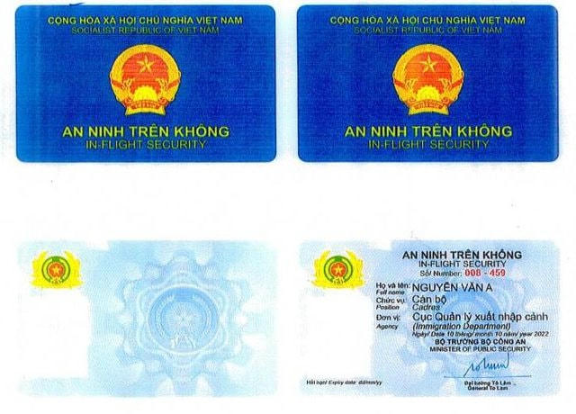 Dự thảo quy định thông tin trên Thẻ, cụ thể: Mặt trước thẻ ghi tên nước Cộng hòa xã hội chủ nghĩa Việt Nam; Hình Quốc huy Cộng hòa xã hội chủ nghĩa Việt Nam; Tên thẻ An ninh trên không. Mặt sau gồm: Phù hiệu, số hiệu Công an nhân dân; Ảnh chân dung, họ và tên, chức vụ, đơn vị công tác; Ngày, tháng, năm cấp, cơ quan cấp; Ngày, tháng, năm hết hạn.