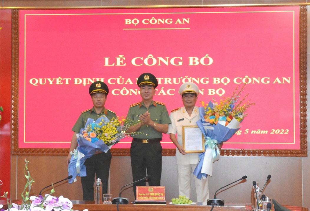 Thay mặt Đảng ủy Công an Trung ương, lãnh đạo Bộ Công an, Thứ trưởng Trần Quốc Tỏ tặng hoa chúc mừng Trung tướng, PGS.TS Trần Vi Dân; trao Quyết định và tặng hoa chúc mừng Thiếu tướng, PGS.TS Phan Xuân Tuy.