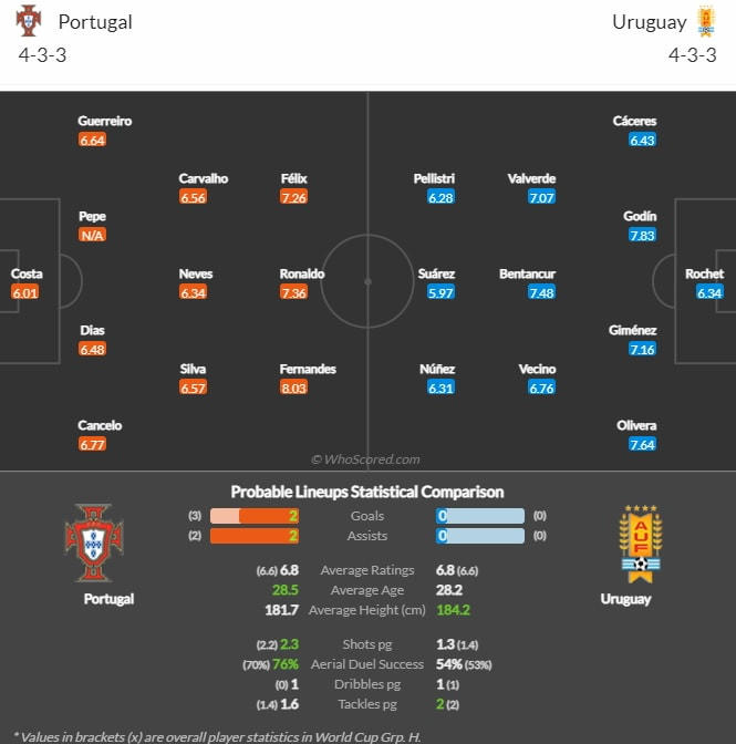 Về phía Bồ Đào Nha, trong khi Ronaldo một lần nữa gây chú ý ở trận thắng Ghana, thì Bruno Fernandes lại đóng vai trò quan trọng ở tuyến giữa. Anh có thể giúp Bồ Đào Nha kiểm soát nhịp độ trận đấu với Uruguay.