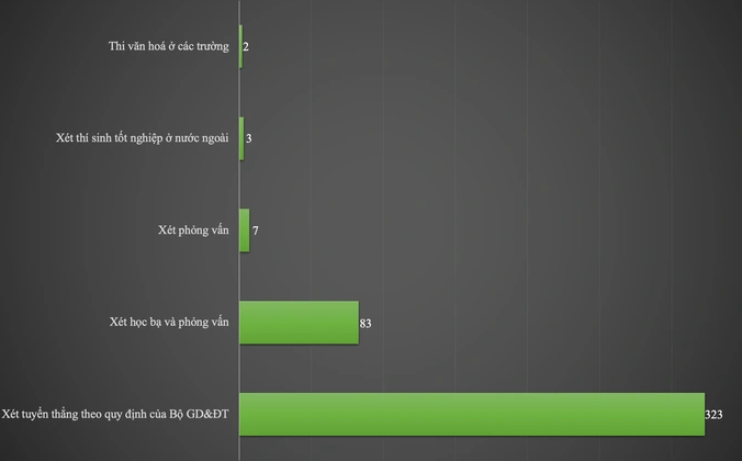 5 phương thức có số lượng thí sinh nhập học thấp nhất gồm: Xét qua phỏng vấn, xét thí sinh tốt nghiệp THPT ở nước ngoài, xét tuyển thẳng theo quy định của Bộ GD&ĐT, thi văn hóa ở các trường.