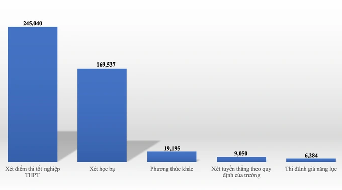 Cụ thể: 5 phương thức có số lượng thí sinh nhập học cao nhất gồm: Xét điểm thi tốt nghiệp THPT, xét học bạ, xét tuyển thẳng theo đề án của trường, xét theo bài thi đánh giá năng lực và phương thức khác.