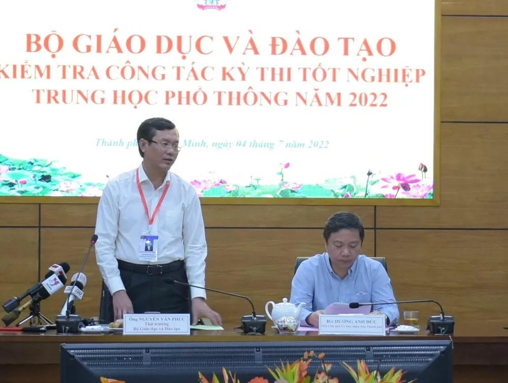 Ngày 4/7, Thứ trưởng Bộ Giáo dục và Đào tạo (GDĐT) Nguyễn Văn Phúc dẫn đầu đoàn đã đến kiểm tra công tác chuẩn bị Kỳ thi tốt nghiệp THPT năm 2022 tại TP HCM và dự hội nghị kiểm tra trực tuyến tại Bà rịa - Vũng Tàu.