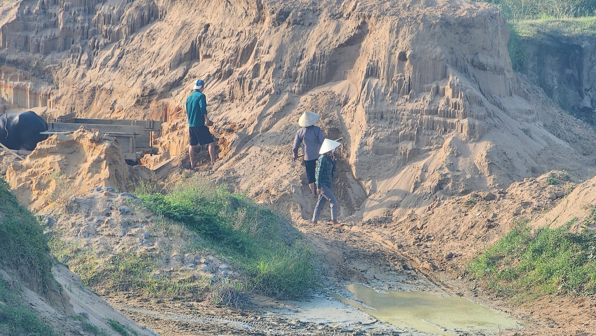 Chiều 1/9, tại khu vực bờ sông Chu (thuộc thôn Vân Lộ, xã Xuân Hồng), có gần 10 chiếc xe bò, xe công nông và hơn 20 người đang khai thác cát trái phép tại bờ sông.Theo quan sát, điểm khai thác này nằm ẩn khuất sau những rặng cây cao hơn đầu người, cộng với việc đang trong kỳ nghỉ lễ, vì vậy, mọi hoạt động đều diễn ra rất tấp nập.Đầu tiên, người dân đi xe bò, xe công nông tới khu vực khai thác, sau đó dùng các dụng cụ thô sơ như cuốc, xẻng… để xúc cát lộn đất lên xe.Sau đó, các xe này sẽ đưa tới bãi tập kết “di động” ở cách đó khoảng 30 – 50m. Khi bãi đã chất đủ cao, các xe tải ben loại 2 chân (loại dưới 1,5 tấn) sẽ di chuyển tới đây để xúc cát, sau đó chạy thẳng lên đê, vận chuyển về phía gần UBND xã Xuân Hồng mang đi tiêu thụ. Theo người dân địa phương cho biết, điểm đổ của các xe ben này là các bãi tập kết vật liệu xây dựng, nằm rải rác trên đường tỉnh lộ 515 và trong khu vực dân cư thuộc các thôn Vân Lộ, Bất Cang, Ninh Thành (thuộc xã Xuân Hồng).Ngày 14/9, ghi nhận tại hiện trường, cả một khu vực bãi bồi rộng hơn 2,5 ha đã trở nên nham nhở, tan hoang với nhiều hố sâu.Cac vách đứng có chiều cao từ 3 - 5m. Đa phần số tài nguyên bị người dân lấy đi là cát có pha lẫn đất, số còn lại ít hơn là cát đẹp, có thể dùng trực tiếp trong xây dựng.Ở khắp mọi nơi, đâu đâu cũng thấy những “núi” cát dựng đứng bị “móc” ra một cách không thương tiếc.Xe bò là phương tiện người dân dùng để vận chuyển cát.Ông Hoàng Công Phú (43 tuổi, trú thôn Vân Lộ, sống gần khu vực trên) cho biết: Tình trạng khai thác cát trái phép đã diễn ra trong khoảng từ 2 – 3 năm qua, bất chấp nhiều đợt truy quét ráo riết của chính quyền. Trong ảnh là con đường mà các xe bò, xe công nông vận chuyển cát ra khỏi khu vực khai thác.Phía trên những điểm khai thác cát trái phép là khu lăng mộ của người dân.Vào ngày 12/9 vừa qua, ông Hoàng Văn Đồng, Chủ tịch UBND huyện Thọ Xuân (thứ 2, từ trái sang) đã đích thân đi kiểm tra thực địa khu vực khai thác cát trái phép nêu trên. Qua kiểm tra, đã xác định được bãi này có diện tích khoảng 2,5 ha, trong đó có 1,8 ha thuộc UBND xã Xuân Hồng quản lý và 0,7 ha thuộc bãi tập kết cát của Công ty Cổ phần Ngọc Tân Bình.Sau đó, vào chiều 14/9, Phòng TNMT huyện Thọ Xuân đã phối hợp với UBND xã Xuân Hồng ghi nhận thực địa, đánh giá khối lượng cát mà người dân đã xúc đi. Đại diện Phòng TNMT huyện Thọ Xuân cho biết, về hướng xử lý, phòng cũng có trao đổi với chính quyền xã và đưa ra phương án là lu lèn lại toàn bộ khu vực này để nó bằng phẳng, sau đó giao cho người dân và đại diện thôn Vân Lộ để họ trồng màu, từ đó kiêm luôn việc bảo vệ bãi bồi. Để chấn chỉnh và xử lý nghiêm tình trạng này, Chủ tịch UBND huyện Thọ Xuân đã chỉ đạo phòng TNMT tổ chức làm việc với Công ty Cổ phần Ngọc Tân Bình để xác định cụ thể ranh giới bãi tập kết đã được tỉnh cấp, yêu cầu Công ty quản lý theo quyết định của UBND tỉnh giao. Ngoài ra, giao phòng Nội vụ tiến kiểm điểm trách nhiệm tập thể, cá nhân tại xã Xuân Hồng và các phòng, ngành, đơn vị có liên quan đã để xảy ra tình trạng khai thác cát trái phép, thực hiện ngay các biện pháp xử lý, có giải pháp kiên quyết ngăn chặn vi phạm, tuyệt đối không được để tình trạng khai thác cát trái phép tái diễn.