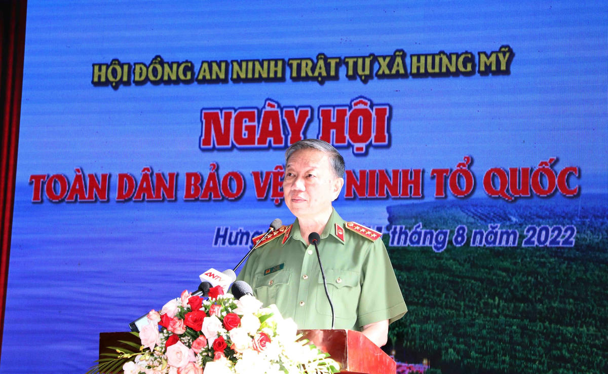 Ngày 11/8, Đại tướng Tô Lâm, Bộ trưởng Bộ Công an cùng đoàn công tác của Bộ Công an đã đến dự Ngày hội Toàn dân bảo vệ an ninh Tổ quốc (TDBV ANTQ) năm 2022 tại xã Hưng Mỹ, huyện Cái Nước, tỉnh Cà Mau.