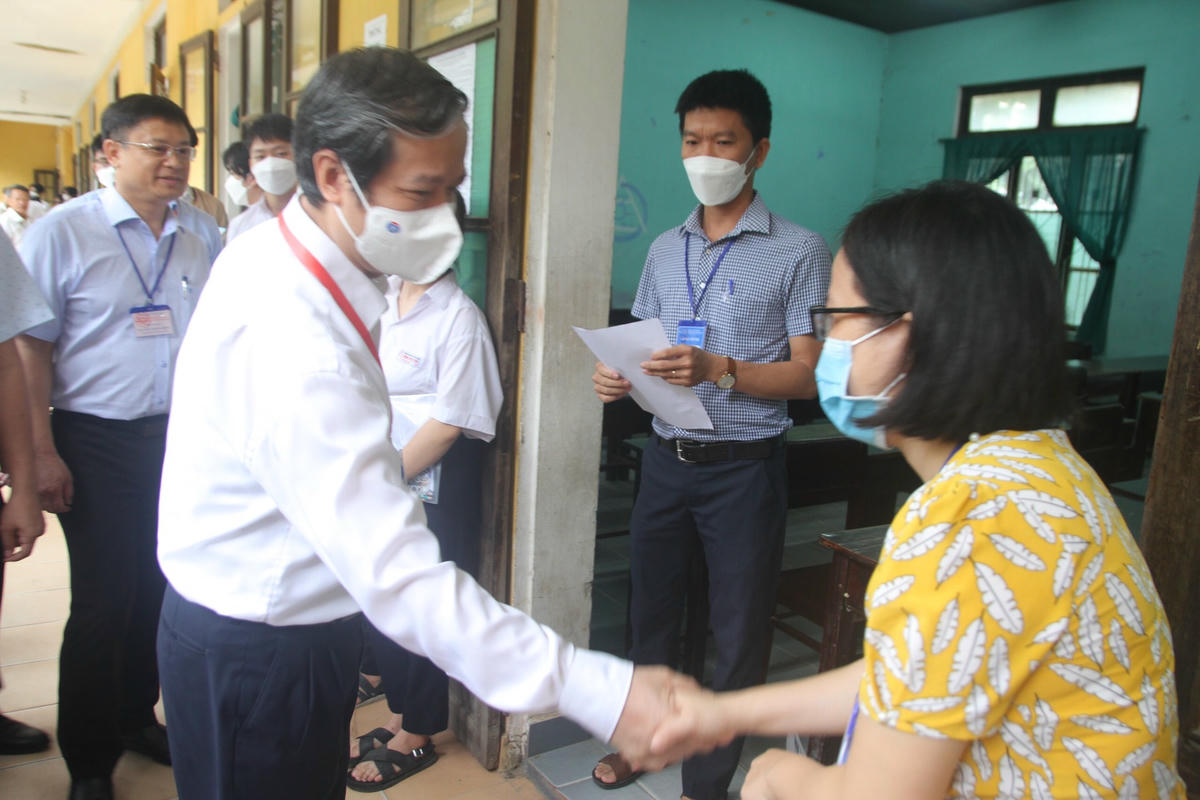 Sáng 7/7, trước buổi thi môn Ngữ Văn của Kỳ thi tốt nghiệp THPT năm 2022, Bộ trưởng Bộ GDĐT Nguyễn Kim Sơn đã tới kiểm tra điểm thi Trường THPT Đặng Huy Trứ, huyện Hương Trà, tỉnh Thừa Thiên - Huế và động viên học sinh, giáo viên ở điểm thi này.