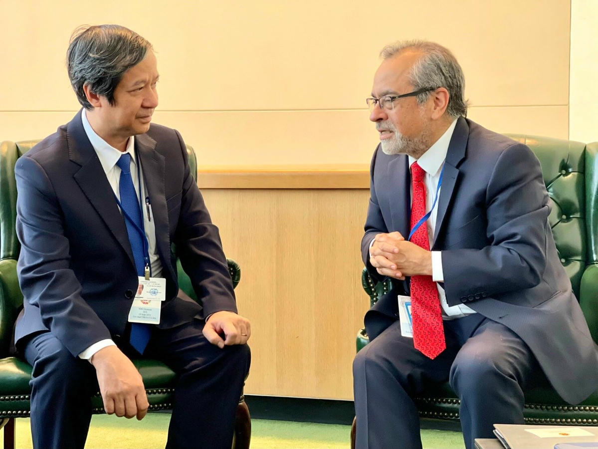 Bên lề Hội nghị Thượng đỉnh giáo dục, Bộ trưởng Bộ GDĐT Nguyễn Kim Sơn có các cuộc gặp gỡ song phương với Bộ trưởng Bộ Giáo dục Hoa Kỳ; Giám đốc Giáo dục toàn cầu của Ngân hàng thế giới (World Bank); đại diện Tập đoàn Microsoft và Đại học New York…