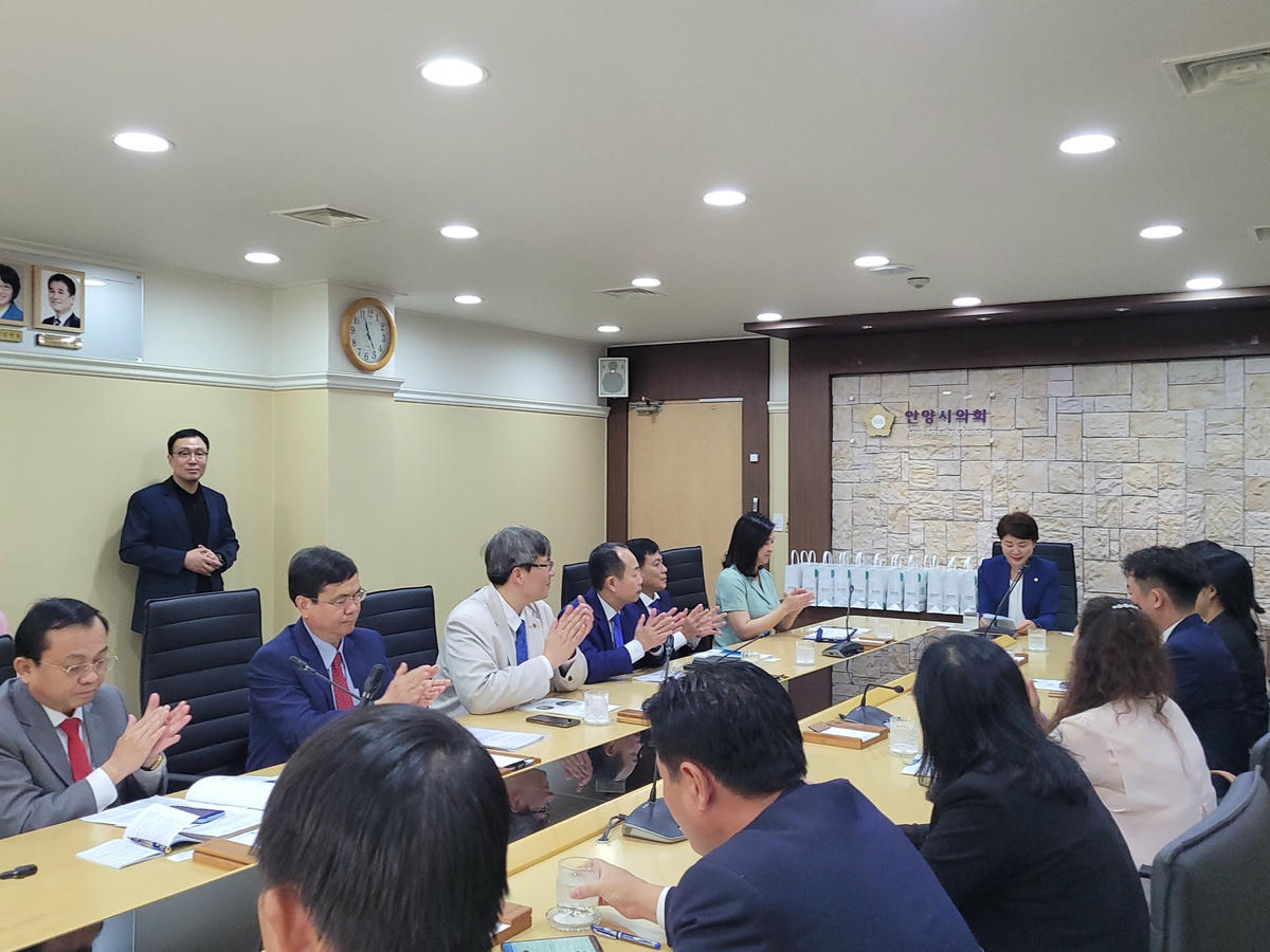 Sau đó, đoàn đã có buổi làm việc với Chủ tịch Hội đồng thành phố Anyang – Bà Choi Byung In và lãnh đạo các bộ phận của thành phố. Buổi làm việc thực hiện nhờ sự kết nối của Hiệp hội VKBIA.