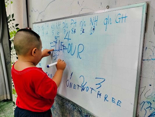 Chỉ tay vào những bức tường đầy chữ và số, chị Thuỷ (mẹ cháu Khải) cho biết, đây là những chữ do cháu Khải tự viết ra và đọc. Để con thỏa sức phát triển trí tuệ, chị để bé thoải mái vẽ trên tường nhà mà không hề bôi xóa. Chị cũng mua những bộ đồ chơi chữ, bảng viết để con thỏa sức phát triển khả năng tư duy.