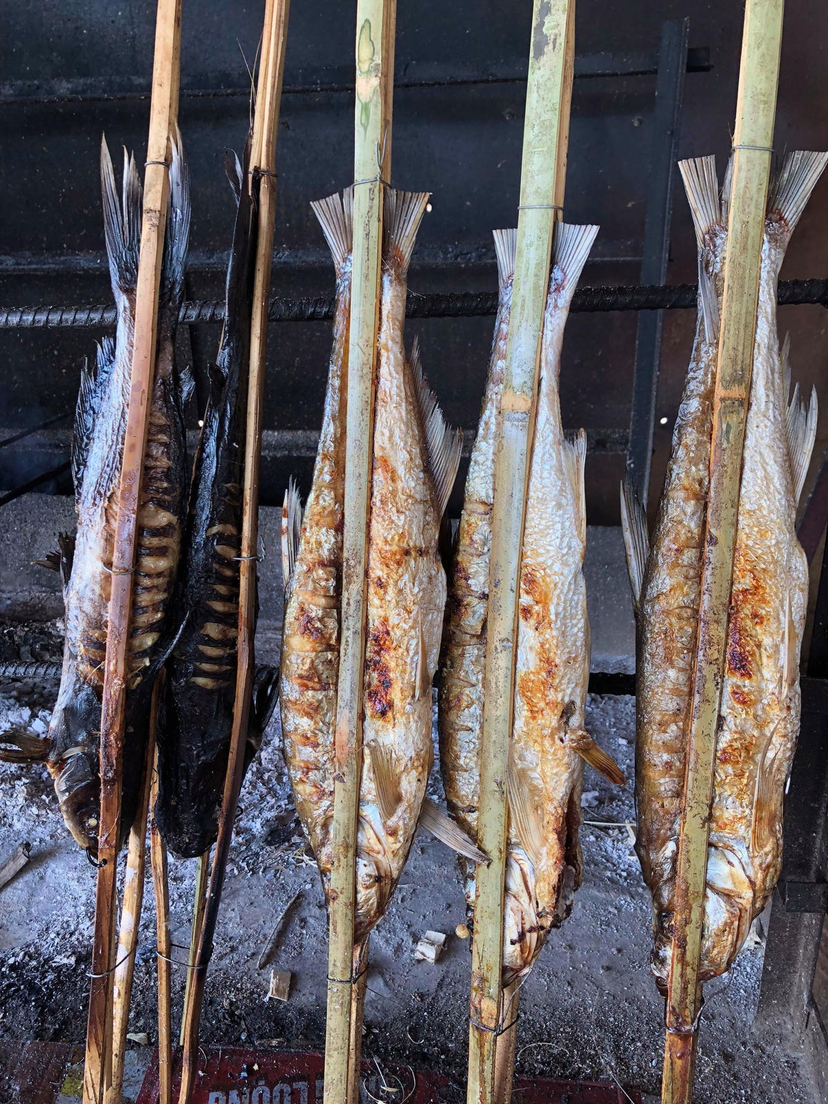 Bà con sống ven sông sau khi khai thác, đem cá về sơ chế, ngâm ướp gia vị và dùng que tre kẹp thành từng xâu cá nướng trên than hồng. Bên bếp than hồng, những xiên cá vàng ươm, thơm lừng.