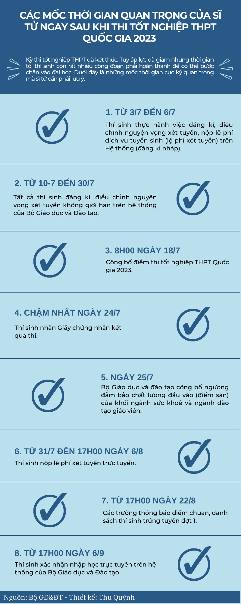 Các mốc thời gian quan trọng sau thi tốt nghiệp THPT Quốc gia 2023 Chủ Nhật 02/07/2023 16:25 (GMT+7) Kết quả thi tốt nghiệp THPT năm 2023 sẽ công bố đồng loạt vào 8h ngày 18/7 tại các Sở Giáo dục và Đào tạo và các đơn vị đăng ký dự thi. Thu Quỳnh