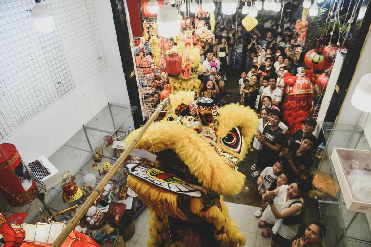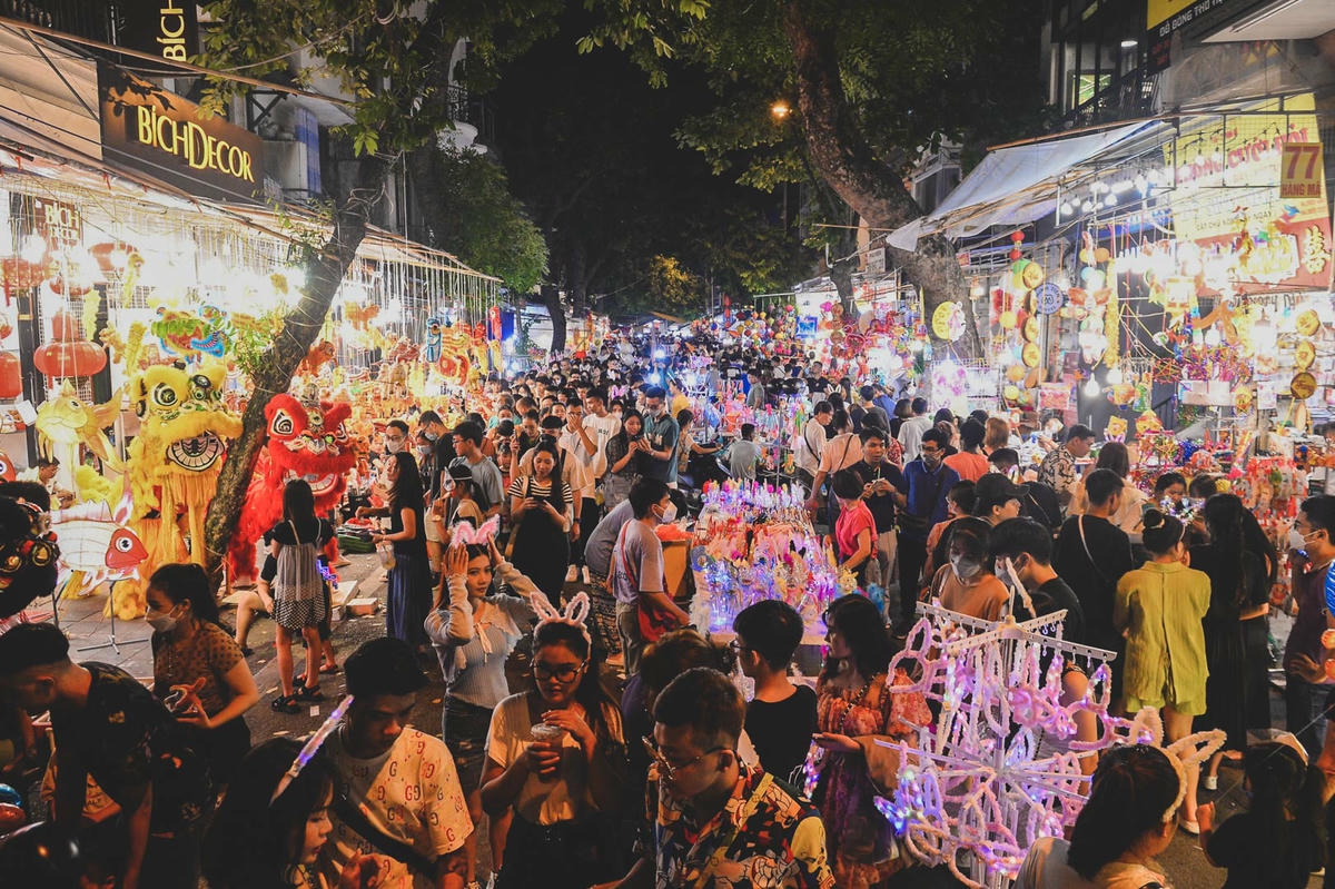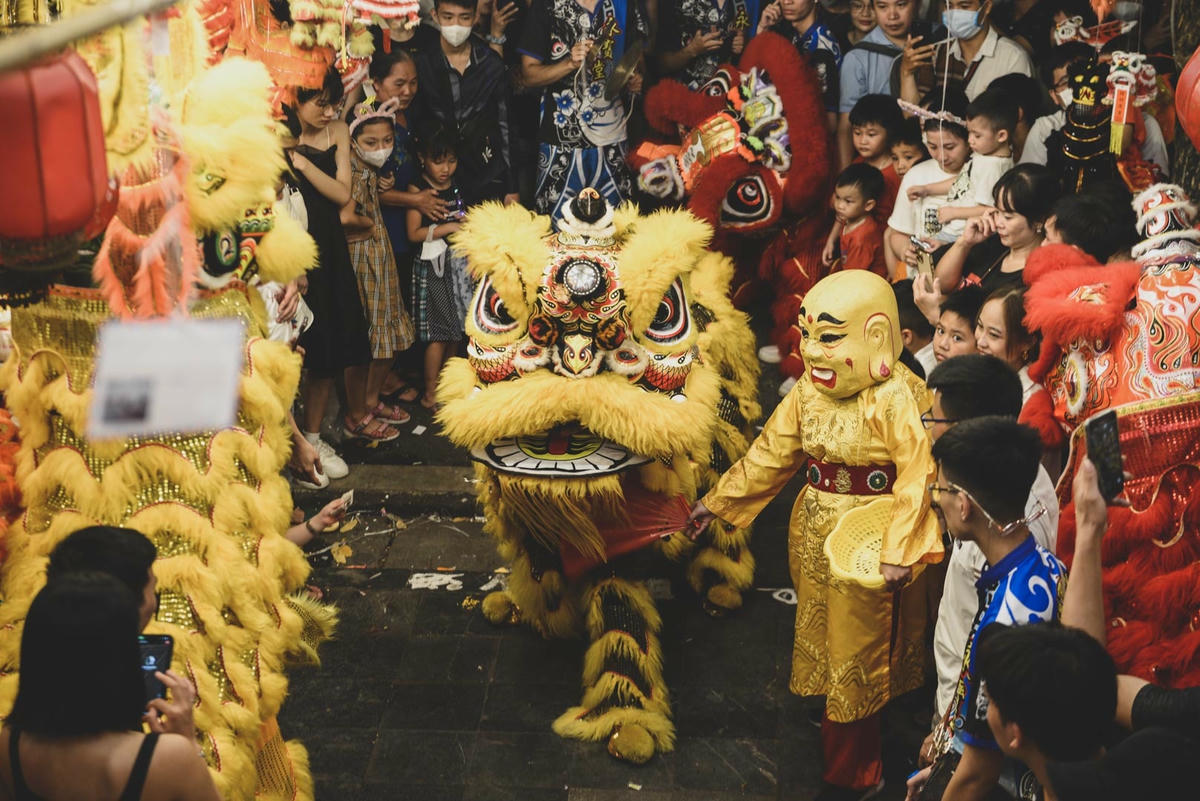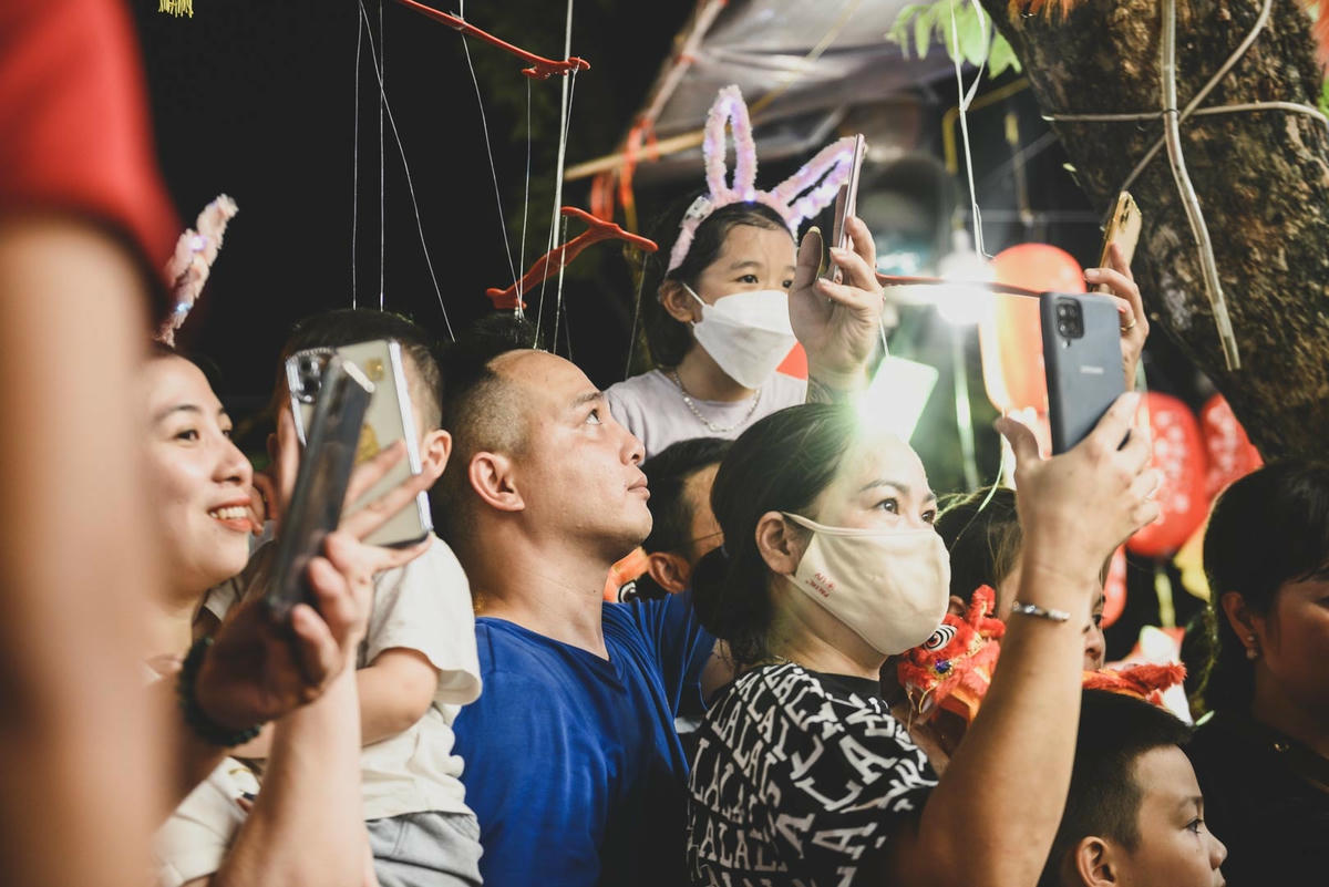 Theo như ghi nhận của PV Đại Đoàn Kết Online, ngay từ rất sớm, phố Hàng Mã đã đón tiếp hàng nghìn người dân, khách du lịch trong và ngoài nước đến đây đón Trung thu.Những gian hàng đồ chơi, đồ trang trí Trung thu đã làm con phố Hàng Mã thêm sinh động.Dù vẫn có nhiều người đến mua đồ chơi Trung thu, nhưng nhu cầu không còn cao như những ngày trước nên nhiều tiểu thương có thời gian rảnh rỗi tận hưởng không khí ở Hàng Mã vào tối trung thu.Cách đó không xa, hàng nghìn phương tiện nườm nượp đổ về tuyến đường Phùng Hưng, khiến giao thông ở đây trở nên ùn tắc.Nhiều người e ngại cảnh chen chúc, nên chỉ tranh thủ ghi lại khung cảnh lung linh trên phố Hàng Mã khi đi ngang qua."Năm nay thực sự may mắn khi Rằm Trung thu lại đúng vào ngày thứ 7, nên mình đã quyết định đưa gia đình lên đây. Không khí trên phố tối nay rất vui và náo nhiệt", anh Định (33 tuổi, Nam Từ Liêm) chia sẻ.Những gian hàng đồ chơi cũng hấp dẫn nhiều người tới mua.Đến khoảng 8h tối, tiết mục múa lân rồng diễn ra, thu hút không chỉ những em nhỏ, mà cả người lớn cũng tập trung rất đông. Múa lân là một nét đẹp văn hóa in sâu trong văn hóa của bao thế hệ người dân Việt Nam mỗi dịp Rằm Trung thu.Nhiều người nhanh tay ghi lại những hình ảnh mỗi năm có một lần này.Nhiều em nhỏ tỏ ra vô cùng thích thú khi được chứng kiến, tương tác với những chú lân.Cùng lúc đó, các tuyến phố khác xung quanh khu vực Hồ Hoàn Kiếm cũng thu hút người dân tới tham quan."Mình đến Hà Nội du lịch đã hơn 1 tháng và thật may mắn được chứng kiến không khí Trung thu ở đây. Thực sự Hà Nội hôm nay rất đẹp", anh Daniel (27 tuổi, khách du lịch Anh) chia sẻ.Đến 9h tối, tất cả các tuyến phố Hàng Bài, Hàng Bông, Phùng Hưng,... chính thức rơi vào ùn tắc cục bộ, người dân chỉ có thể di chuyển từng bước một.