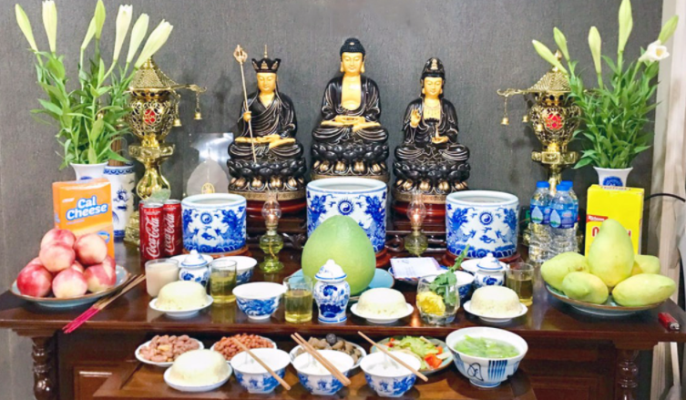 Đối với gia đình thờ Phật thì mâm cúng chay phải đặt cao nhất, rồi mới đến mâm cúng thần linh và gia tiên.