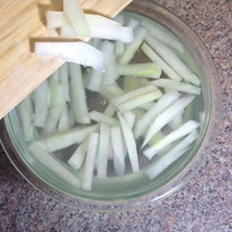 Bí đao sau khi loại bỏ vỏ và ruột, bạn cắt thành những đoạn dài, kích cỡ vừa phải.