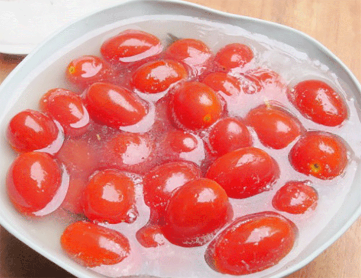 Cho cà chua bi vào trong phần nước vôi trong, ngâm trong vòng 6 tiếng để cà chua được giòn. Sau đó, vớt ra và để ráo.