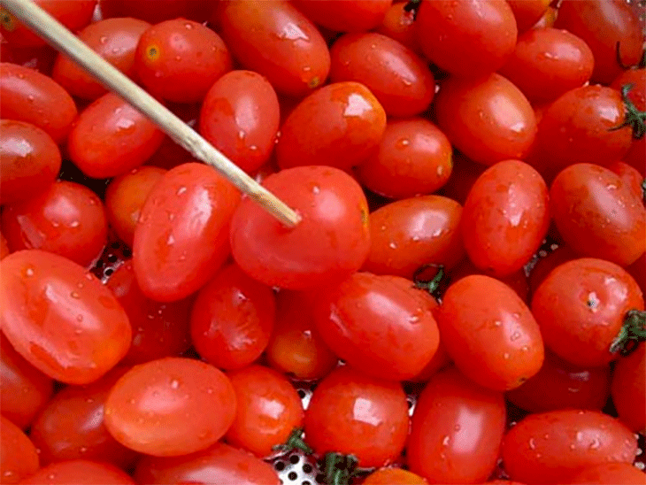Cà chua bi sau khi mua về bạn tiến hành rửa nhiều lần dưới nước cho thật sạch để loại bỏ bụi bẩn và thuốc trừ sâu, sau đó để lên rổ cho ráo nước.