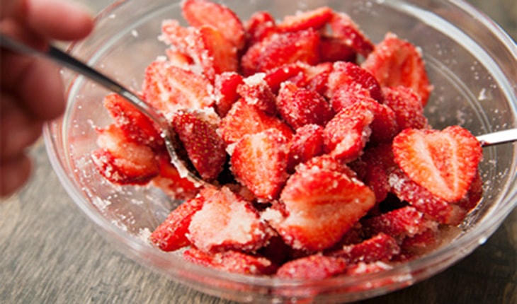 Sau đó, trộn đều dâu với 750 gr đường, lượng đường có thể thay đổi tùy sở thích của bạn và để ở nơi khô ráo khoảng 4 tiếng để dâu ngấm đường.