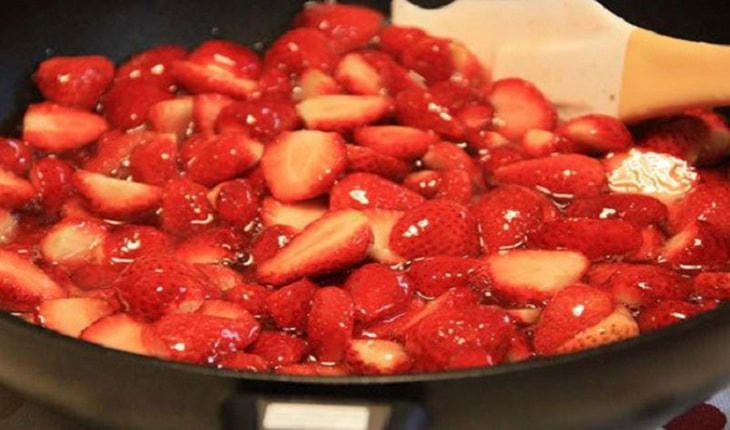 Cho dâu tây ngâm đường vào chảo, đun ở lửa vừa, đến khi sôi thì điều chỉnh lửa về mức nhỏ nhất.