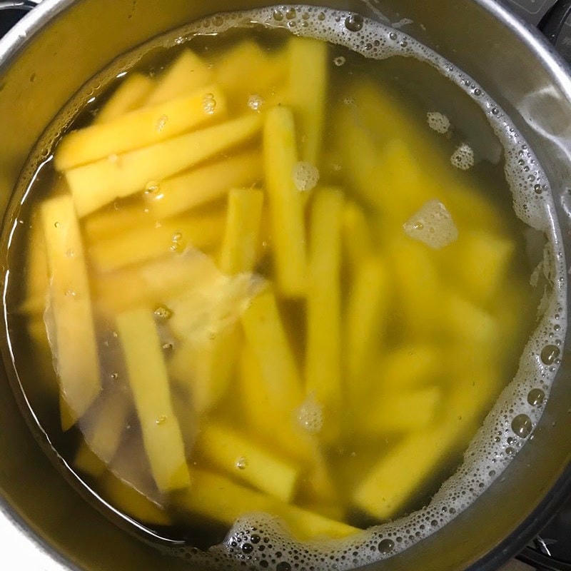 Sau đó, cắt khoai thành từng miếng dài khoảng 3 đốt ngón tay và có độ dày khoảng 1/2 đốt ngón tay để trong quá trình sên khoai không bị nát.