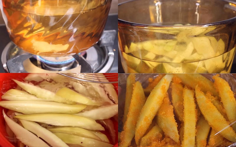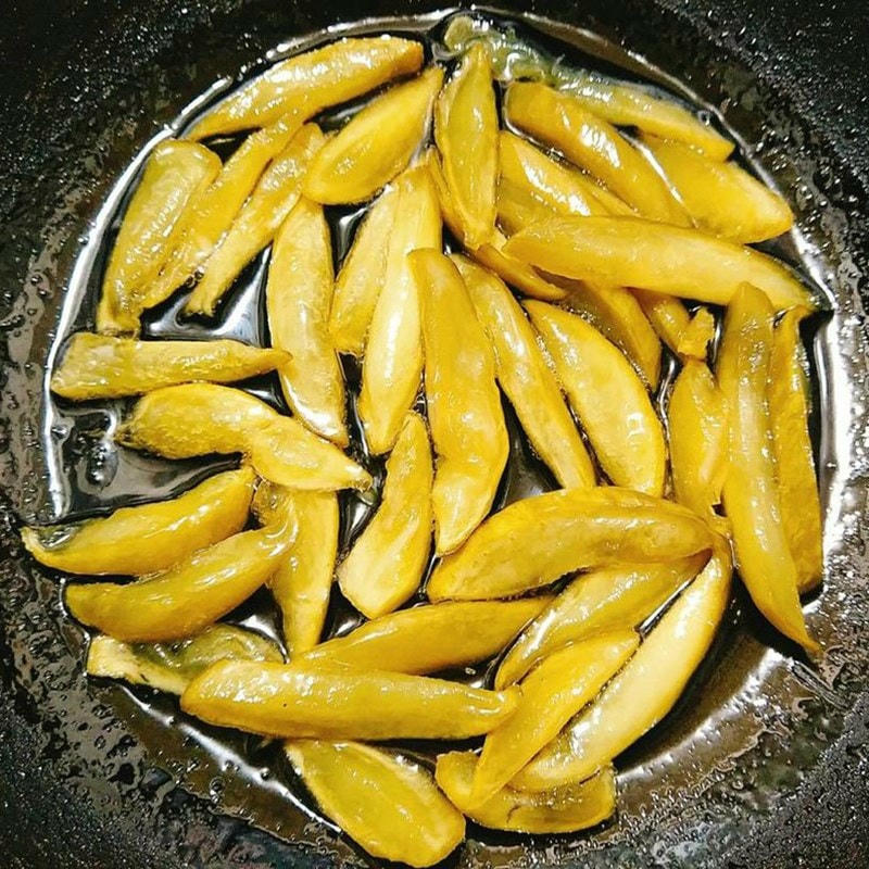 Sau khi ngâm trong 6 tiếng, nước đường sẽ tan chảy ra rất nhiều. Trút phần nước đường đã tan vào chảo rồi đem thắng cho tới khi nước đường sôi và kẹo lại thì đổ xoài vào.