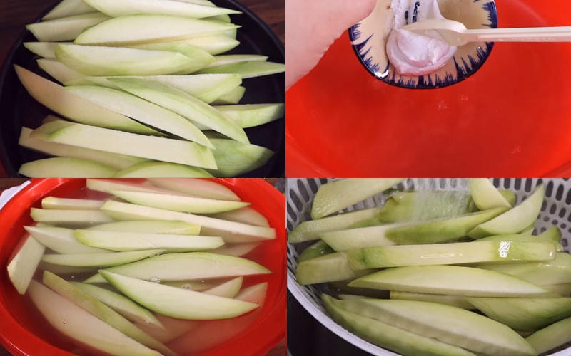 Xoài sau khi cắt xong, bạn cho chúng vào nước vôi trong khoảng 6 tiếng để khi sên mứt xoài sẽ không bị bở hay nát. Chắt bỏ nước ngâm rồi vớt xoài ra, bạn lưu ý rửa sạch xoài nhiều lần với nước để sạch vôi.