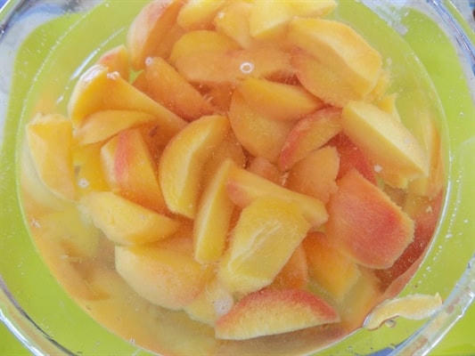 Bước 3: Cắt từng miếng đào cho vào nước lạnh có pha muối, rồi rửa sạch cho ra rổ.