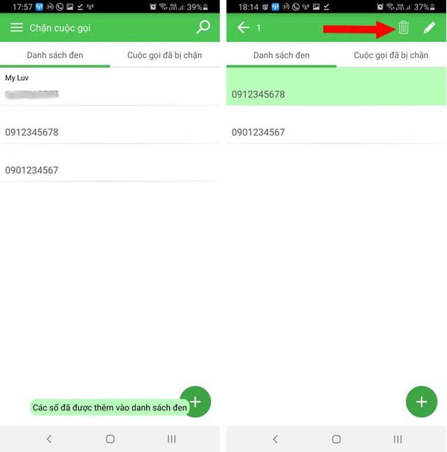 Danh sách các số đã bị chặn sẽ được hiển thị trên giao diện chính của ứng dụng. Để loại bỏ một số khỏi danh sách chặn cuộc gọi, bạn nhấn và giữ vào số đó rồi chọn biểu tượng thùng rác ở góc trên bên phải giao diện ứng dụng.