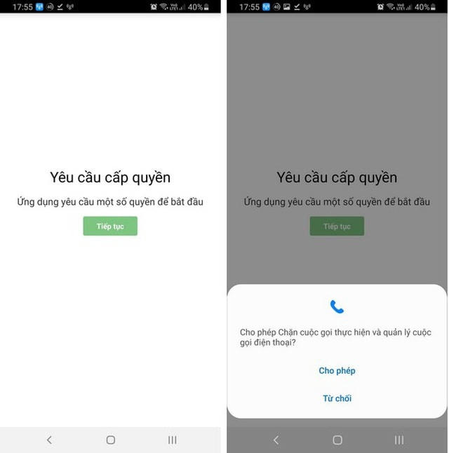 Tại giao diện hiện ra trong lần đầu tiên chạy ứng dụng, Call Blocker sẽ xin người dùng cấp quyền để ứng dụng có thể chặn cuộc gọi từ các số điện thoại không mong muốn. Bạn nhấn nút "Tiếp tục" tại giao diện này, sau đó nhấn chọn "Cho phép" tại các hộp thoại hiện ra để cấp quyền cho ứng dụng.