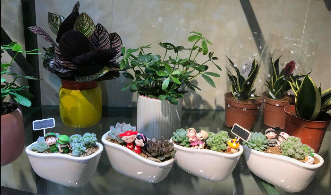 Ngoài những mẫu chậu hoa, loạt các mẫu chậu cây nhỏ để bàn cũng được nhiều cửa hàng tư vấn cho khách. Những chậu cây được trồng kết hợp cùng các bức tượng nhỏ xinh xắn là một lựa chọn thích hợp, những chậu cây này cũng được trồng phù hợp với nhu cầu của khách hàng, lựa theo sở thích của người được tặng mà khách hàng cung cấp.