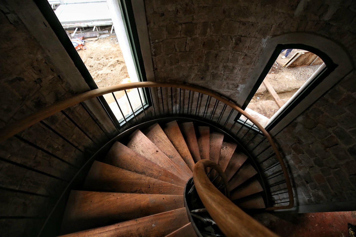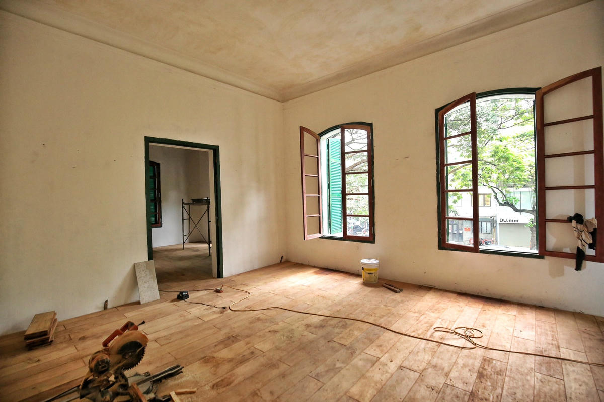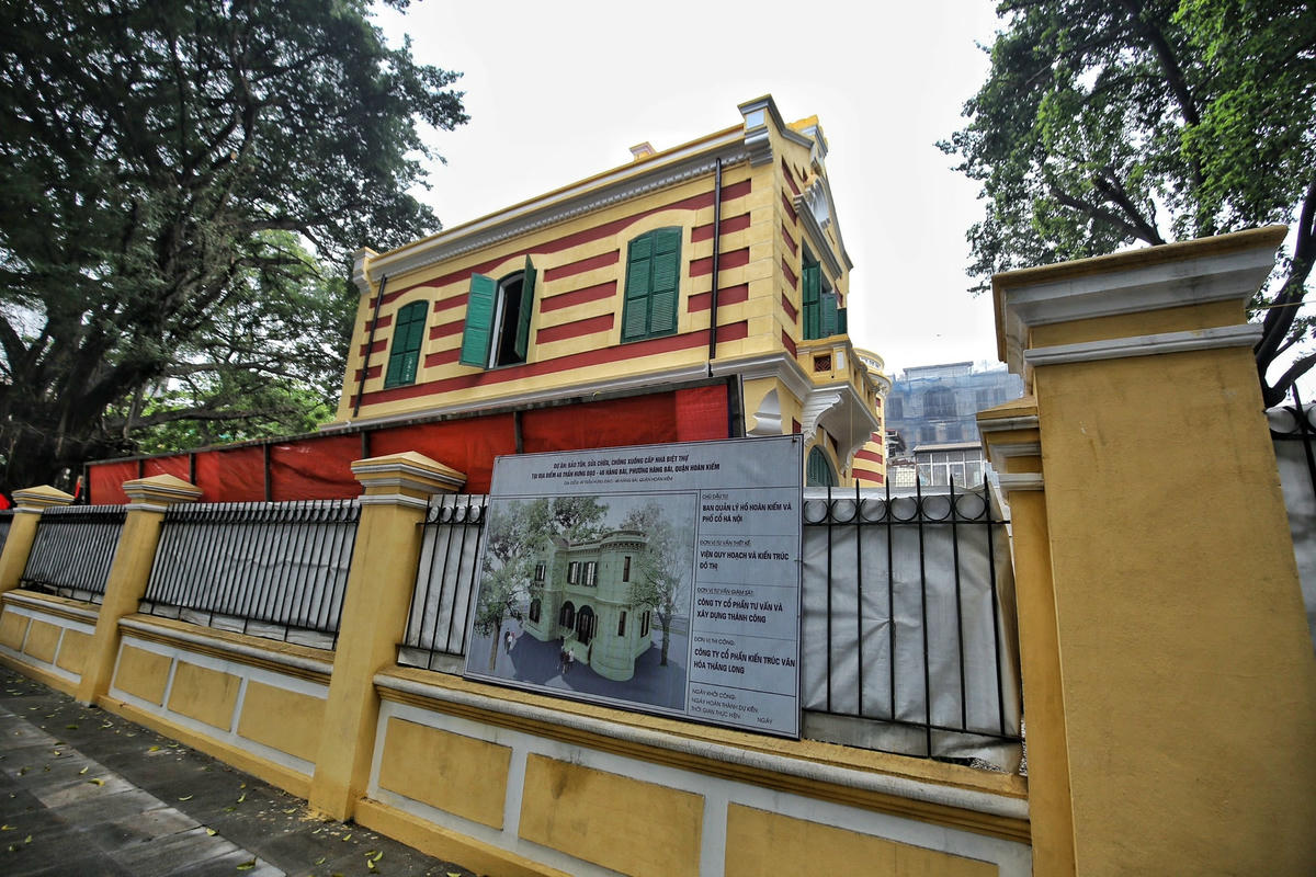 Căn biệt thự 46 Hàng Bài nằm ngay vị trí Ngã tư phố Hàng Bài - Trần Hưng Đạo (quận Hoàn Kiếm, Hà Nội) được mệnh danh là khu đất “kim cương” của Hà Nội. Do được xây dựng từ lâu nên căn biệt thự cổ này đã xuống cấp nghiêm trọng. Trước đây, căn biệt thự cổ này là trụ sở của Nhà xuất bản văn học.Do căn biệt thự xuống cấp nghiêm trọng, ngày 27/4/2022, UBND quận Hoàn Kiếm khởi công dự án bảo tồn, sửa chữa, chống xuống cấp nhà biệt thự 49 Trần Hưng Đạo - 46 Hàng Bài.Sau 1 năm trùng tu, ngôi biệt thự này đã dần thay đổi diện mạo mới.Dự án Bảo tồn, sửa chữa, chống xuống cấp nhà biệt thự 49 Trần Hưng Đạo - 46 Hàng Bài do Ban Quản lý hồ Hoàn Kiếm và phố cổ Hà Nội làm chủ đầu tư, với sự hỗ trợ kỹ thuật của các chuyên gia vùng Ile-de-France (Pháp).Căn biệt thự này có diện tích đất lên tới hơn 990 m2, được xây dựng từ những năm đầu thế kỷ 20, là một trong những công trình còn giữ nguyên được nhiều giá trị kiến trúc.Đại diện chủ đầu tư cho hay việc bảo tồn, tu bổ biệt thự này gặp nhiều khó khăn vì tư liệu liên quan đến bản thiết kế hầu như không còn; hình ảnh còn lưu trữ chỉ là ảnh đen trắng, khi phóng to ảnh lên cũng không xác định rõ được kiến trúc bị hư hại."Dự án này có tổng mức đầu tư khoảng 14,7 tỷ đồng. Tuy nhiên, trong quá trình tu bổ sẽ phát sinh thêm kinh phí vì một số hạng mục đang phải điều chỉnh", đại diện chủ đầu tư cho hay.Theo tìm hiểu, kinh phí đầu tư dự án được sử dụng hoàn toàn bằng vốn ngân sách của quận Hoàn Kiếm.Theo UBND quận Hoàn Kiếm, ngôi biệt thự này nằm trong dự án bảo tồn biệt thự mẫu, nhằm phát huy giá trị di sản văn hóa - lịch sử - kiến trúc của khu phố cũ Hà Nội. Thông qua dự án này sẽ giới thiệu những kỹ thuật cơ bản trong việc bảo tồn, trùng tu một số công trình kiến trúc Pháp, qua đó nâng cao ý thức cộng đồng về bảo tồn di sản.Theo UBND quận Hoàn Kiếm, trong quá trình thi công, tu bổ biệt thự, chuyên gia Pháp và chuyên gia Việt Nam đã làm công tác "khảo cổ học công trình" để tìm ra màu sắc, vật liệu và các chi tiết gốc. Trên cơ sở kết quả khảo cổ, nhóm chuyên gia đưa ra quyết định sử dụng lại các vật liệu màu sắc gốc theo như công trình được xây dựng ban đầu."Hiện tại, các chuyên gia đang quét thử nghiệm một số màu vôi để lựa chọn ra màu vôi gốc nhằm đảm bảo tính chân xác tối đa cho công trình. Màu vôi tường hiện nay chưa phải là màu chính thức của công trình", UBND quận Hoàn Kiếm cho hay.Sàn nhà căn biệt thự cổ này được làm bằng gỗ.Cầu thang lên xuống trong căn biệt thự Pháp cổ.