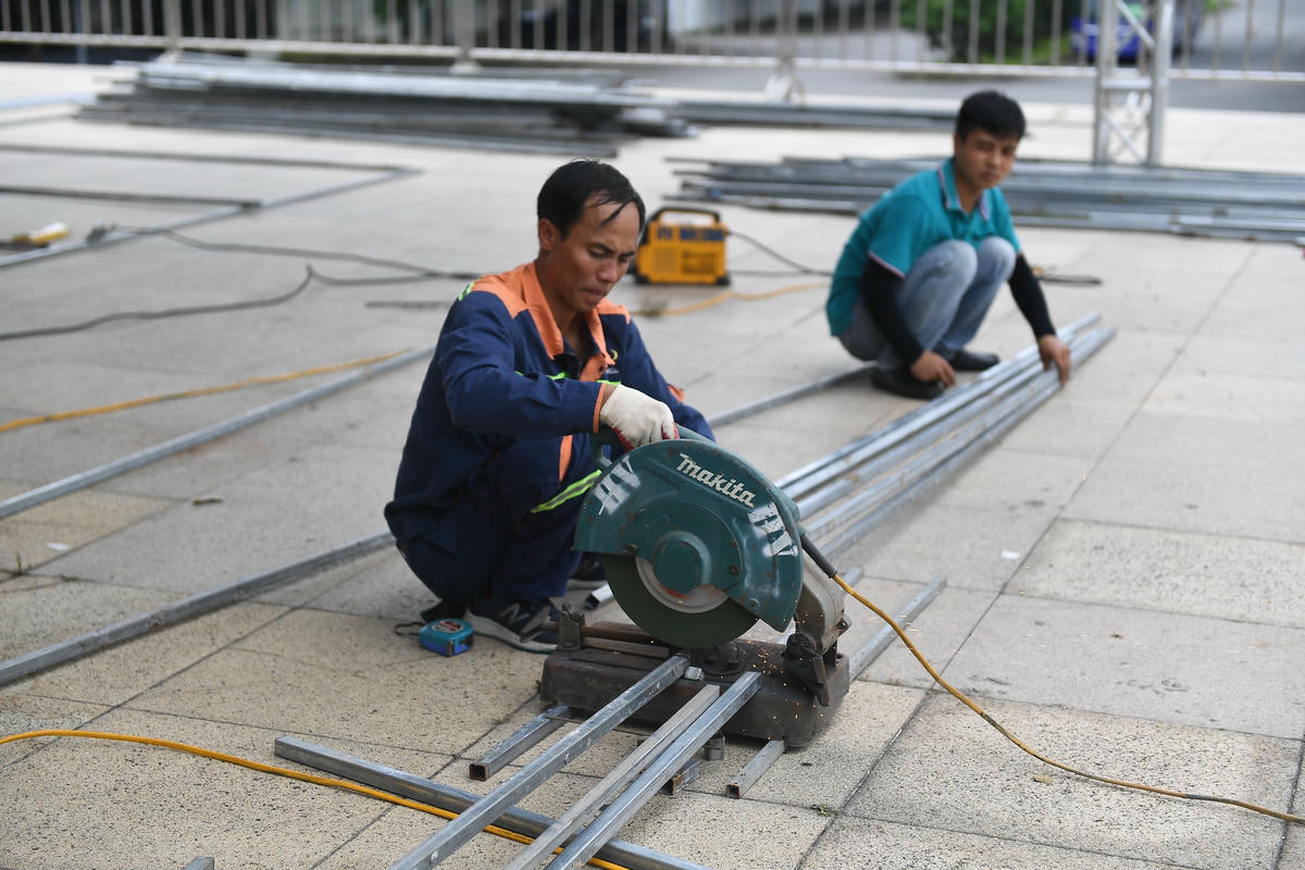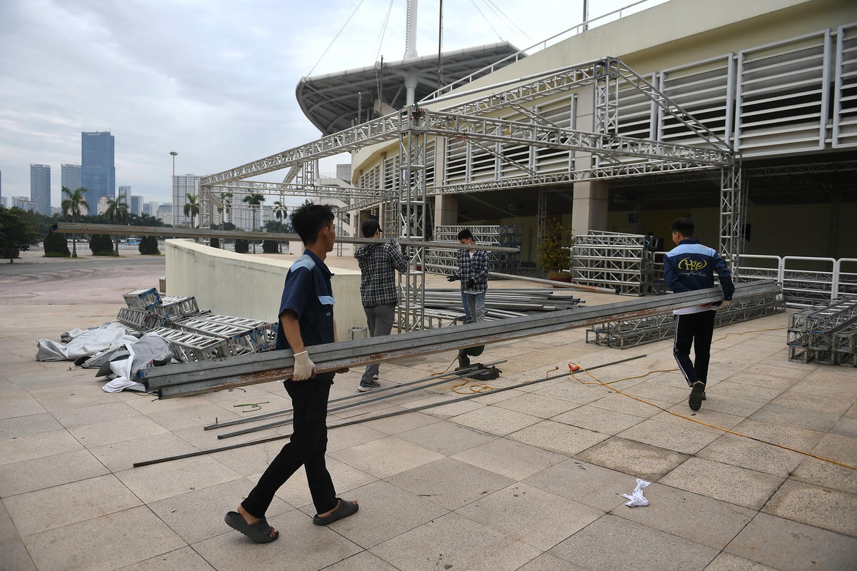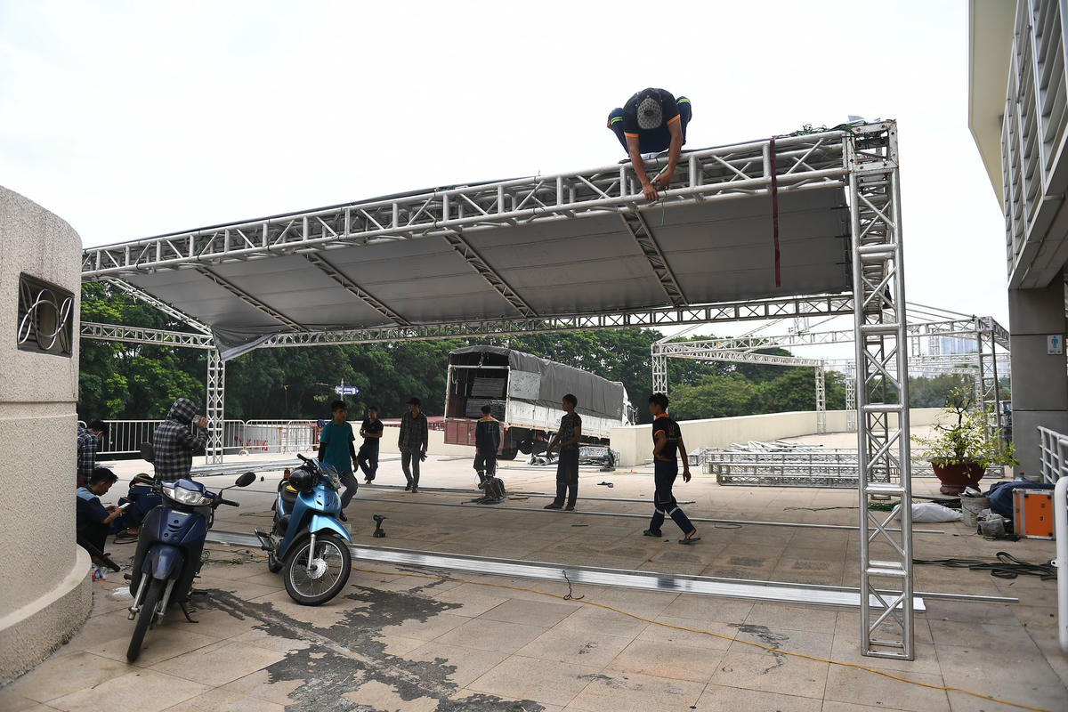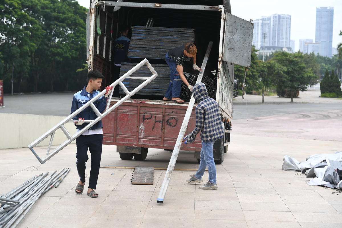Show diễn của nhóm nhạc BlackPink sắp diễn ra tại Hà Nội. Hiện nay, các công nhân đang hối hả làm công tác chuẩn bị sân khấu trên sân vận động Mỹ Đình.