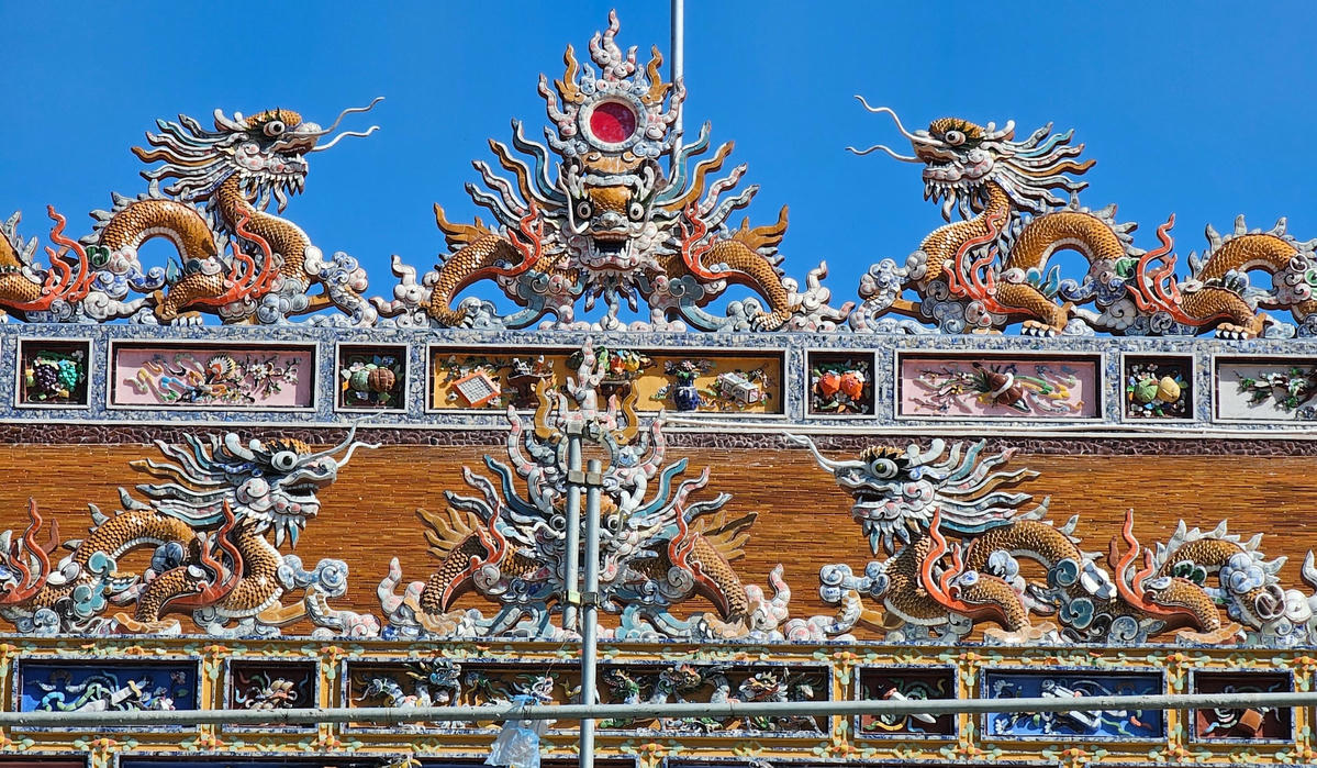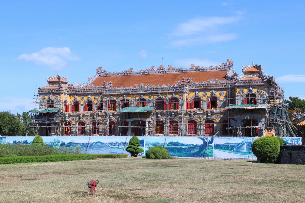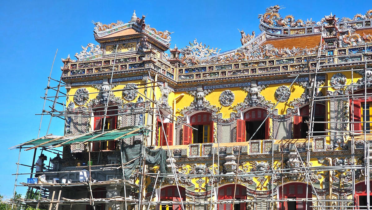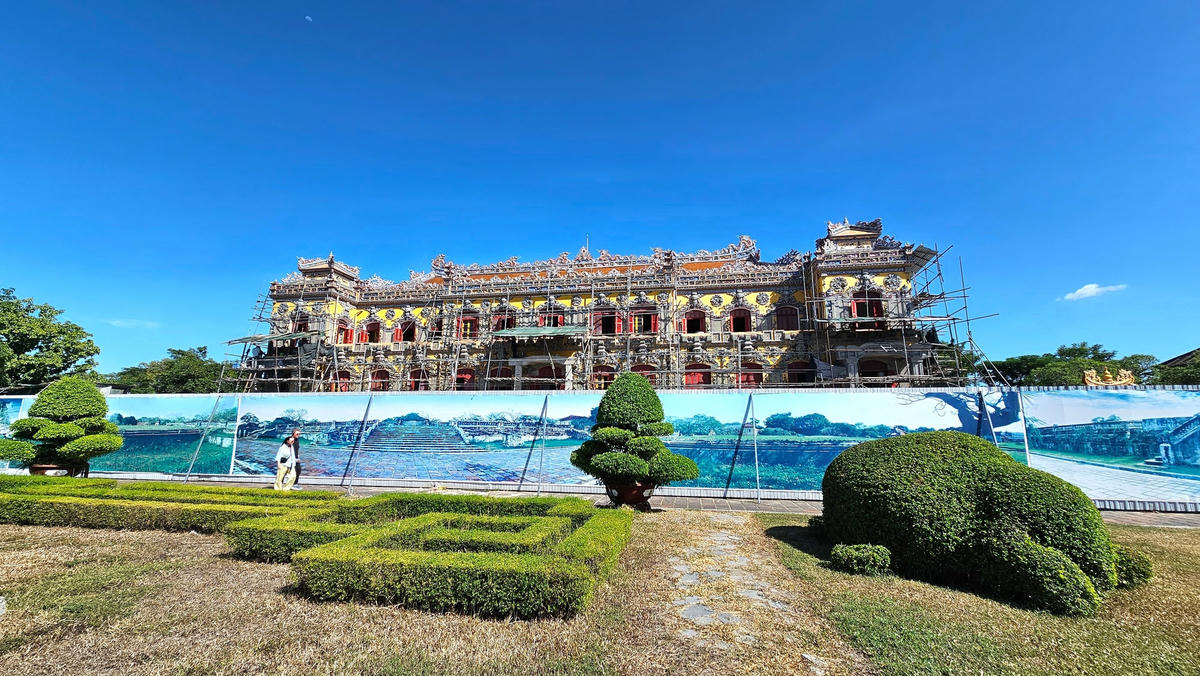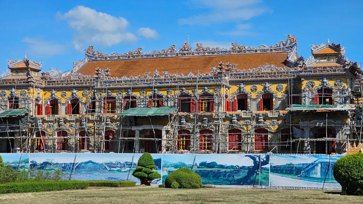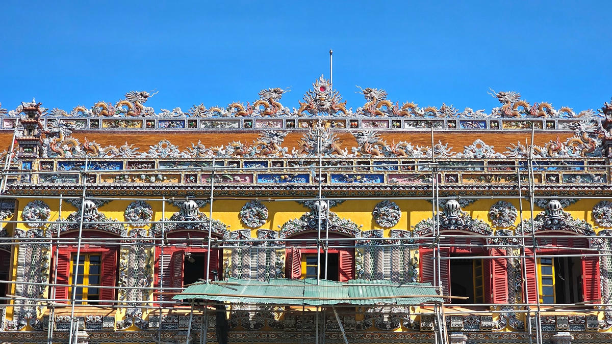 Điện Kiến Trung từng là nơi làm việc của 2 vị vua cuối cùng của triều Nguyễn.Điện Kiến Trung là một trong 5 công trình tiêu biểu và quan trọng bên cạnh điện Thái Hòa, điện Cần Chánh, điện Càn Thành và cung Khôn Thái. Điện được xây dựng vào khoảng năm 1921 đến 1923 dưới thời vua Khải Định. Điện Kiến Trung được xây dựng là sự kết hợp giữa Á và Âu gồm kiến trúc Pháp, kiến trúc phục hưng của Ý pha trộn kiến trúc truyền thống Việt Nam. Ảnh tư liệu.Tuy nhiên, trải qua những biến thiên của thời gian, đến năm 1947 công trình bị phá hủy và trở thành phế tích. Trước thời điểm chưa phục hồi, điện Kiến Trung chỉ còn lại nền móng cũ.Trước thực trạng trên, tỉnh Thừa Thiên - Huế đã phê duyệt Dự án "Tu bổ, phục hồi và tôn tạo di tích điện Kiến Trung" với kinh phí là 123 tỷ đồng.Dự án thực hiện trùng tu, tôn tạo các công trình trong khuôn viên ngôi điện như tường bao nền, hệ thống lan can, tu bổ lầu Kiến Trung, sân Tiền Viên và Hậu Viên, cùng các công trình nhỏ xung quanh và hệ thống hạ tầng kỹ thuật, cây xanh.Sau hơn 4 năm thi công, dự án từng bước được hoàn thiện.Hệ thống hoa văn, rồng được khảm sành trên mái điện Kiến Trung rất tinh xảo.Dự án dự kiến sẽ hoàn thiện vào cuối năm 2023.Theo Trung tâm Bảo tồn di tích Cố đô Huế, việc phục hồi điện Kiến Trung kỳ vọng sẽ là một địa điểm thu hút du khách khi đến tham quan Đại nội Huế.