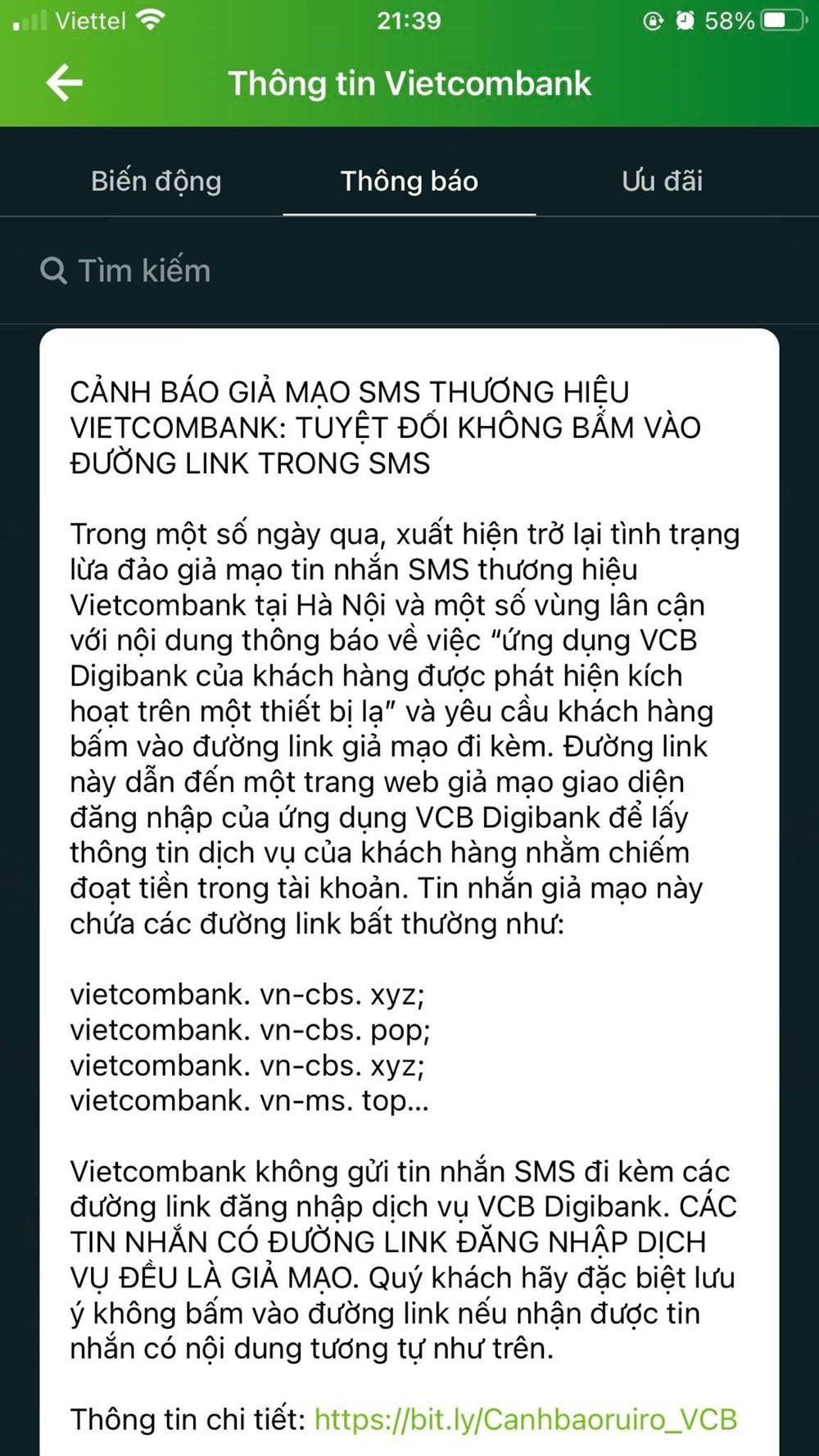 Ngân hàng TMCP Ngoại thương Việt Nam (Vietcombank) cho biết trong những ngày qua đã có khách hàng của ngân hàng này tại Hà Nội và một số vùng lân cận nhận được tin nhắn SMS giả mạo thương hiệu Vietcombank.