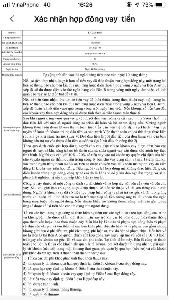 Đến khi đã cài đặt ứng dụng và nhập các thông tin cá nhân như số điện thoại, chứng minh nhân dân... khách hàng sẽ được ứng dụng Auto Cash cho vay một khoản tiền ảo kèm theo một hợp đồng tín dụng với con dấu giả mạo.