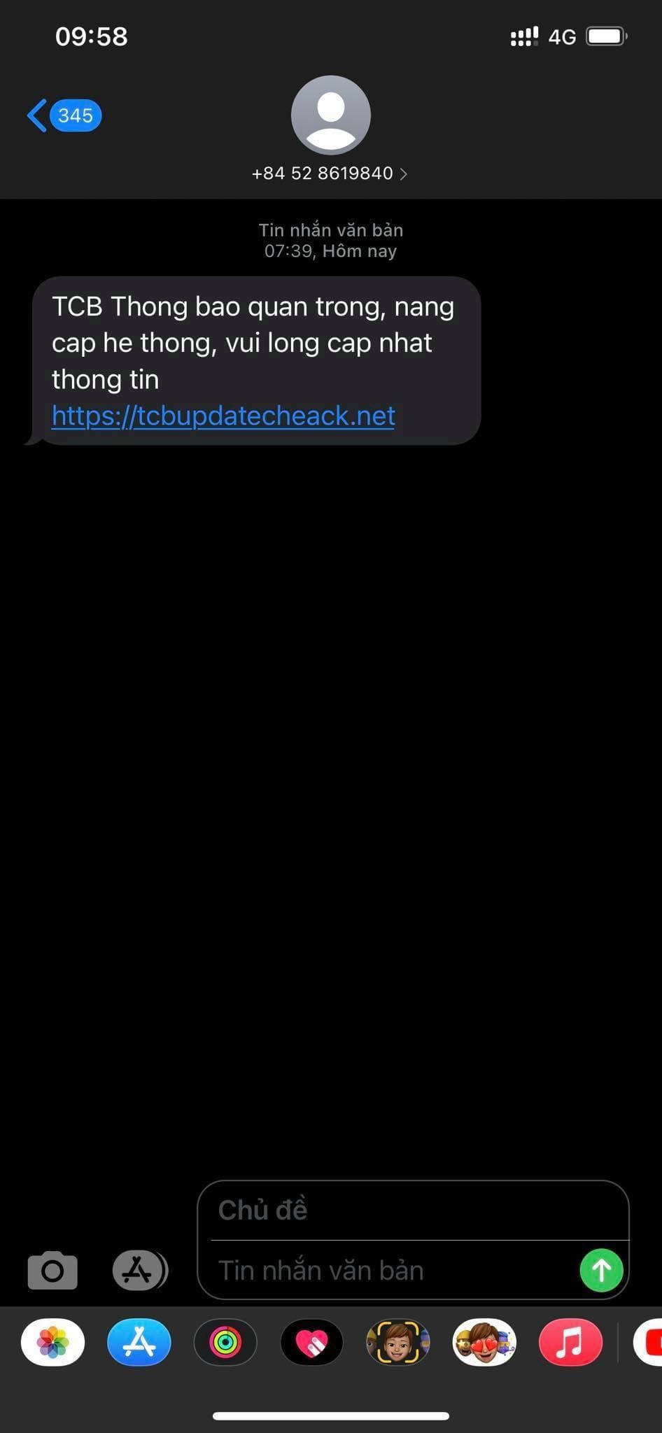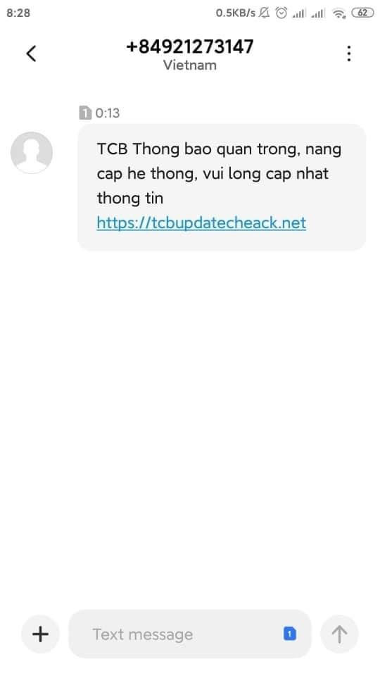 Sáng ngày 24/12, rất nhiều thuê bao di động nhận được tin nhắn từ các số điện thoại như 0921273147 hoặc 0528619840 có nội dung: “TCB Thông báo quan trọng, nâng cấp hệ thống, vui lòng cập nhật thông tin https://tcbupdatecheck.net”.