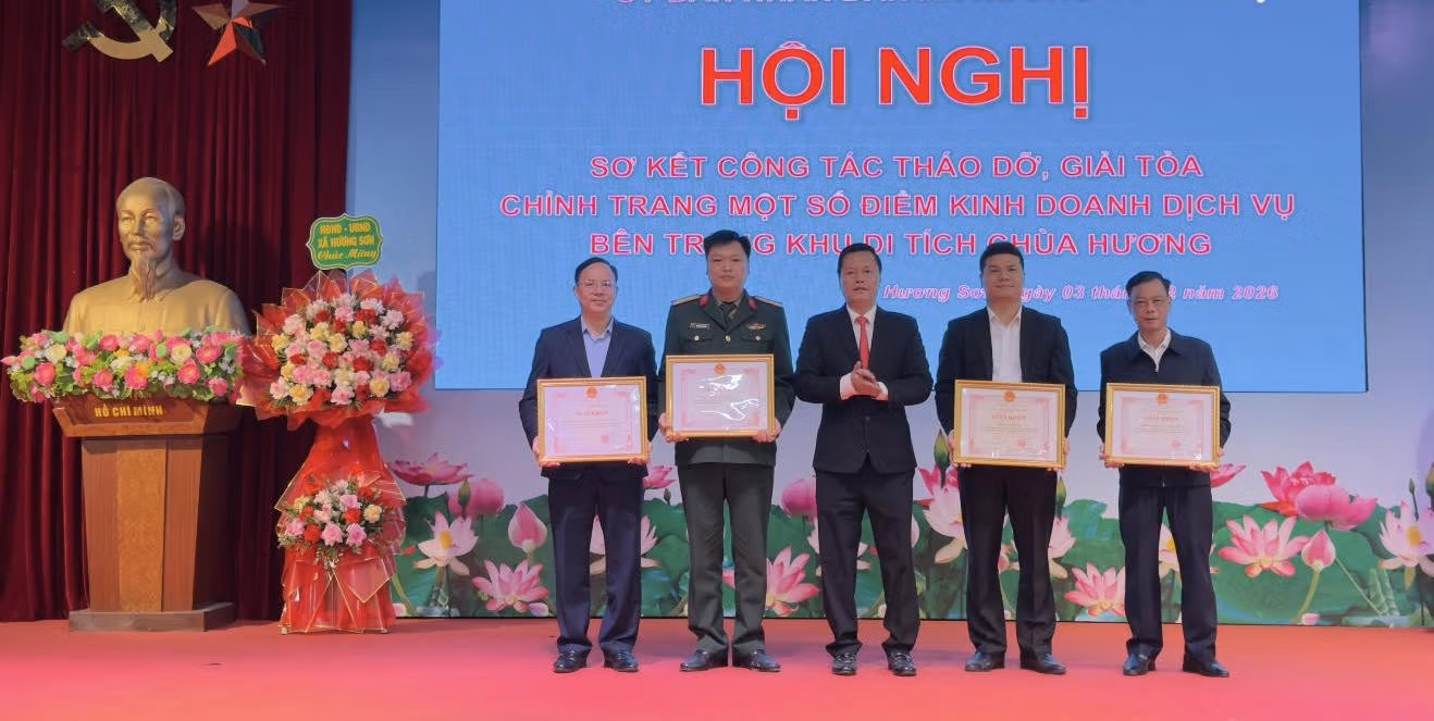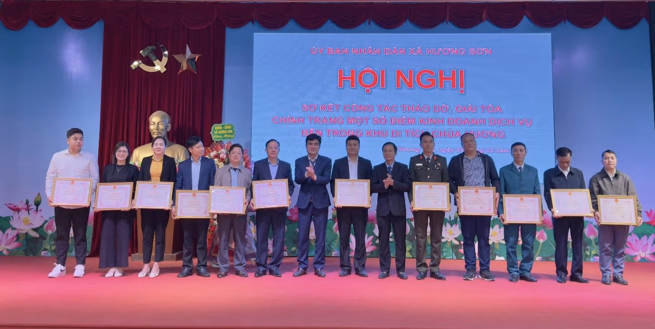 Nhân dịp này, UBND xã Hương Sơn đã khen thưởng cho 4 tập thể, 14 cá nhân có nhiều nỗ lực, trách nhiệm và có nhiều đóng góp trong thực hiện nhiệm vụ tháo dỡ, giải tỏa, chỉnh trang bên trong khu di tích Chùa Hương, góp phần xây dựng khu di tích Chùa Hương ngày càng văn minh, trang nghiêm, chất lượng xứng đáng là điểm đến văn hóa – tâm linh tiêu biểu của Thủ đô.