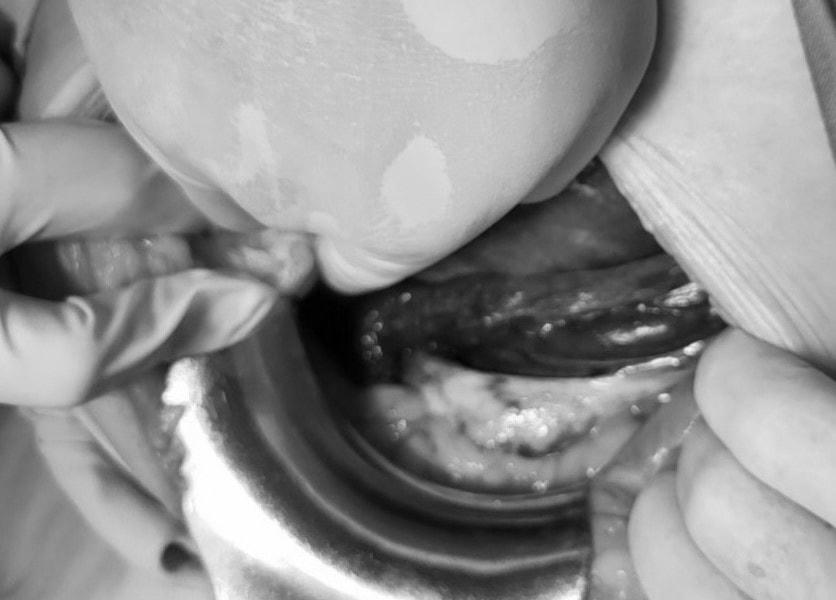 Khi phẫu thuật, rạch da theo đường trắng giữa dưới rốn qua các lớp vào trong ổ bụng, kíp phẫu thuật của Bác sĩ CKII Đàm Văn Hưng - Trưởng Phòng Kế hoạch tổng hợp nhận thấy tử cung sản phụ bị tím đen và xoắn mặt sau tử cung ra mặt trước tử cung, buồng trứng 2 bên cũng tím đen.