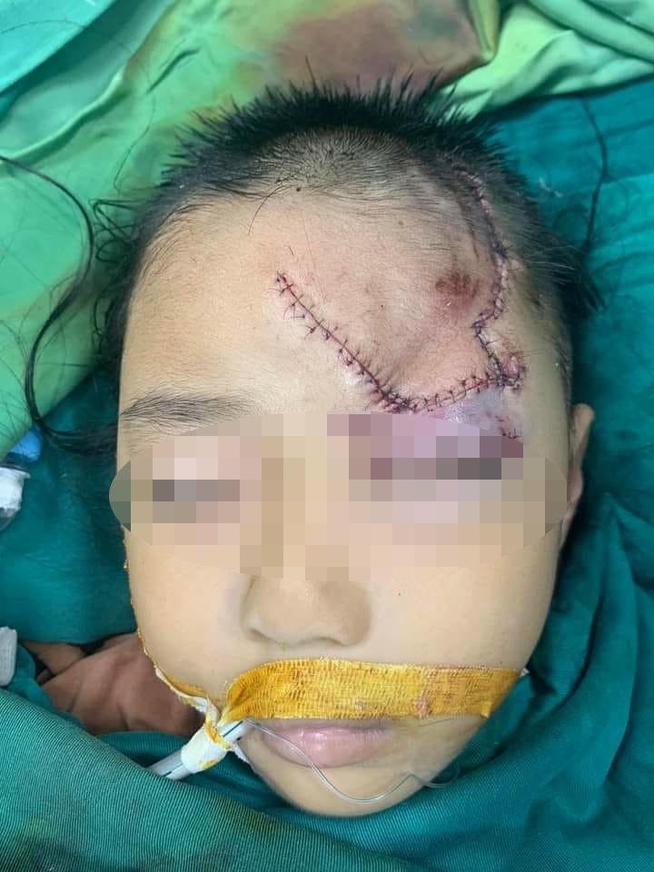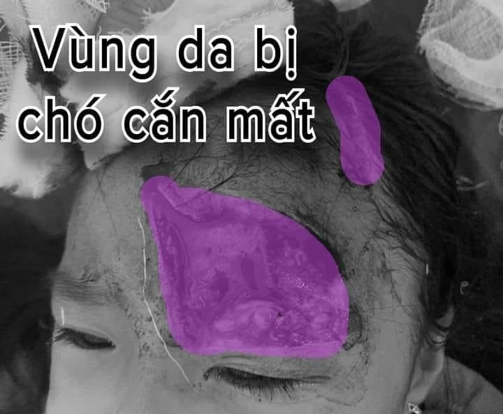 Cháu V. được đưa vào nhập viện trong tình trạng da vùng trán, quanh mắt trái bị cắn mất một mảng da to chừng 8x6cm. Phần lông mày bên trái của cháu V. bị mất hẳn. Ngoài ra còn có vết thương dài khoảng 10cm phía trên đầu.