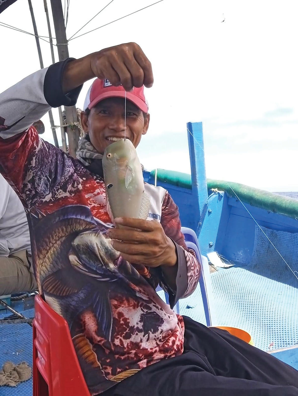 Cùng chung nhóm câu cá biển với anh Phú còn có anh Nguyễn Đức Xuân, 51 tuổi làm nghề kinh doanh cần, dây câu và mồi. Anh Xuân cho biết gia đình có một tiệm bán đồ câu ở đường Tân Kỳ, Tân Quý (quận Tân Phú). “Trước kia tôi đi câu để quảng cáo cần, lưỡi hay dây câu nhưng sau đó thành đam mê lúc nào không hay, thích nhất là khoảnh khắc đưa được con cá lên từ đại dương. Mỗi khi có cần, lưỡi hay mồi mới nhập từ Thái Lan về là tôi lại đi câu để “test” và giới thiệu với anh em cùng đam mê. Tuần này tôi sẽ đi xuống La Gi (Bình Thuận) để câu mực đêm vì mới nhập về lô mồi câu mực rất đẹp”, anh Xuân thông tin.