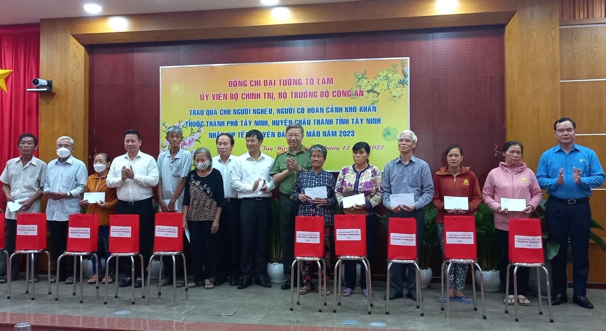 Chiều 28/12, Đại tướng Tô Lâm - Ủy viên Bộ Chính trị, Bộ trưởng Bộ Công an đã đến thăm, trao tặng quà Tết Quý Mão 2023 cho người nghèo tại TP Tây Ninh (tỉnh Tây Ninh).