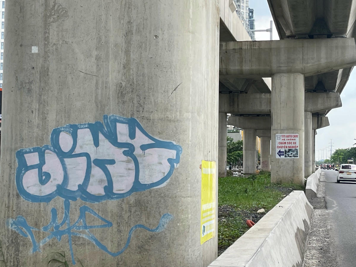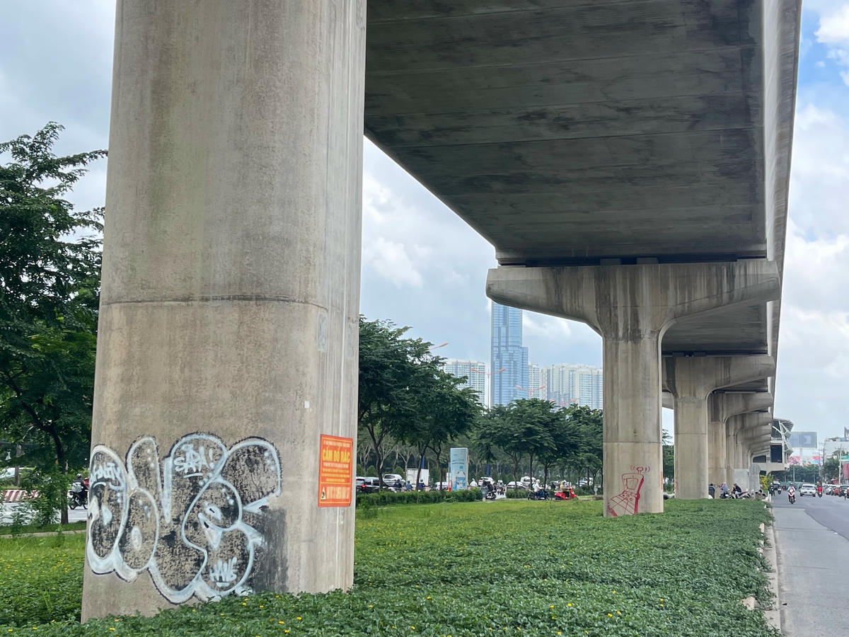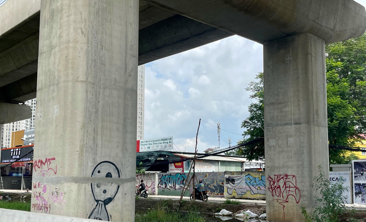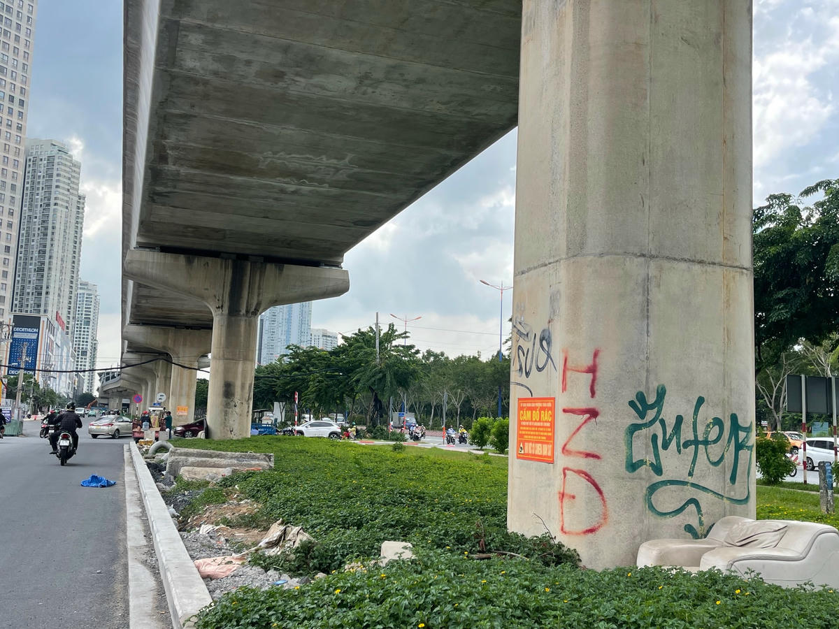 Ngày 12/9, khảo sát dọc tuyến một đoạn đường dài khoảng 5km trong tổng số gần 20km của tuyến metro số 1 Bến Thành-Suối Tiên đoạn đi qua TP Thủ Đức và quận Bình Thạnh, chúng tôi ghi nhận rất nhiều hình vẽ khác nhau bằng nhiều loại màu trên các hạng mục của dự án. Các hình vẽ này tập trung chủ yếu ở các trụ cầu metro, trụ đường. Ngoài các hình vẽ kiểu graffiti (kiểu nghệ thuật đường phố) nhưng rất thô sơ và nhếch nhác thì còn có các biểu quảng cáo rao vặt dán đè lên các công trình metro.