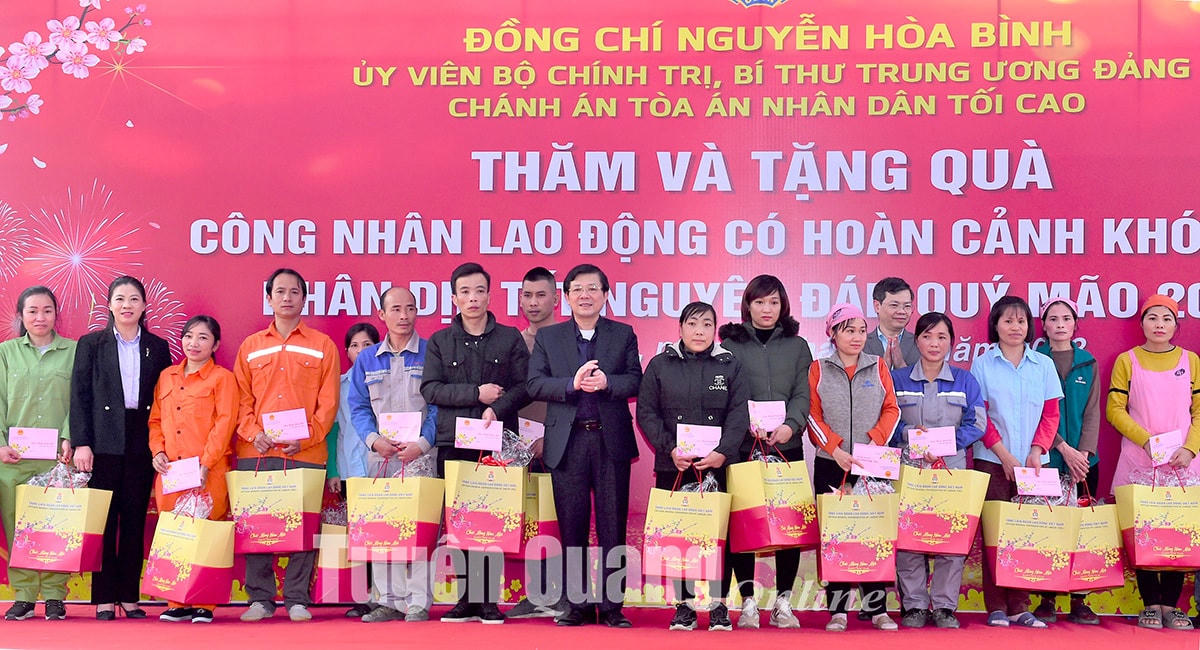 Chiều 9/1, Đoàn công tác của Trung ương do ông Nguyễn Hòa Bình, Ủy viên Bộ Chính trị, Bí thư Trung ương Đảng, Chánh án Tòa án nhân dân (TAND) tối cao làm Trưởng đoàn đã tới thăm và tặng quà gia đình chính sách, công nhân lao động có hoàn cảnh khó khăn tỉnh Tuyên Quang nhân dịp Tết Nguyên đán Quý Mão 2023 tại Khu công nghiệp Long Bình An.