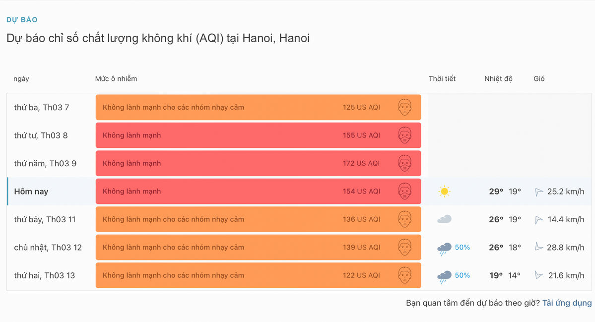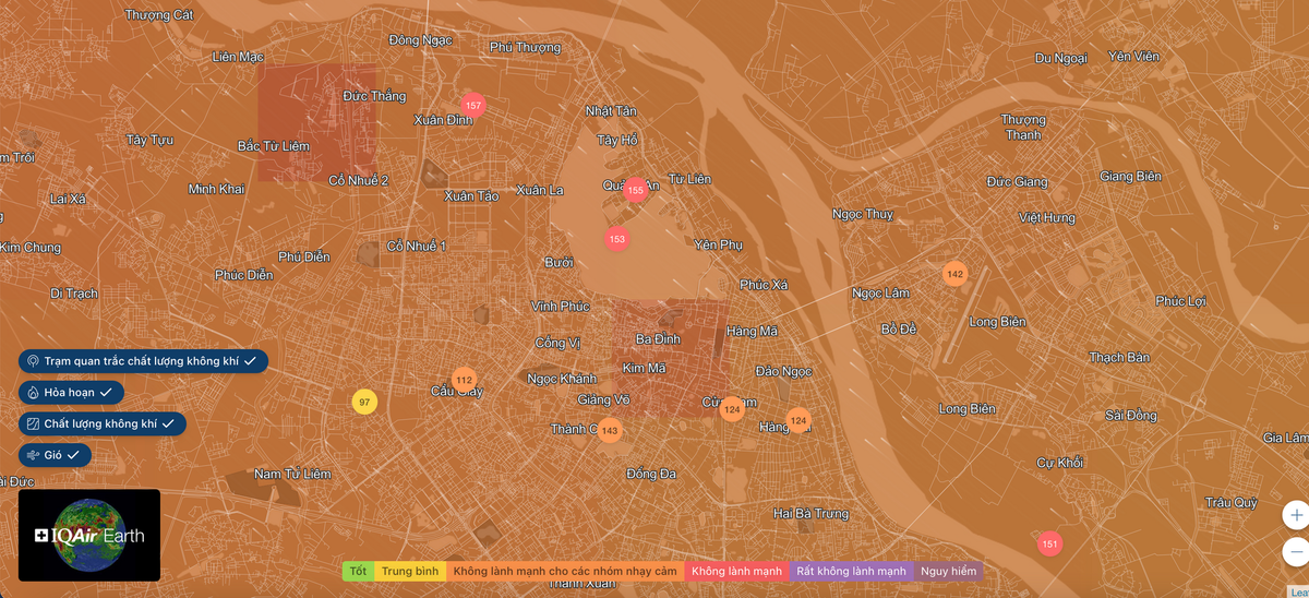 Theo chỉ số quan trắc AQI một số khu vực tại Hà Nội của IQAir.com, những ngày gần đây, chỉ số ô nhiễm không khí lên mức xấu với nồng độ bụi mịn nhiều trạm vượt con số 151-200, ở mức đỏ (mức không khí có hại).