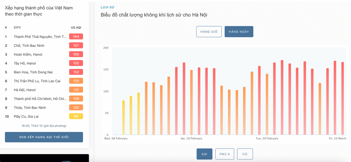 Theo đó, liên tiếp ba ngày nay (từ 8/3 đến 10/3), chỉ số chất lượng không khí tại Hà Nội đều ở mức nguy hại (>151 US AQI).