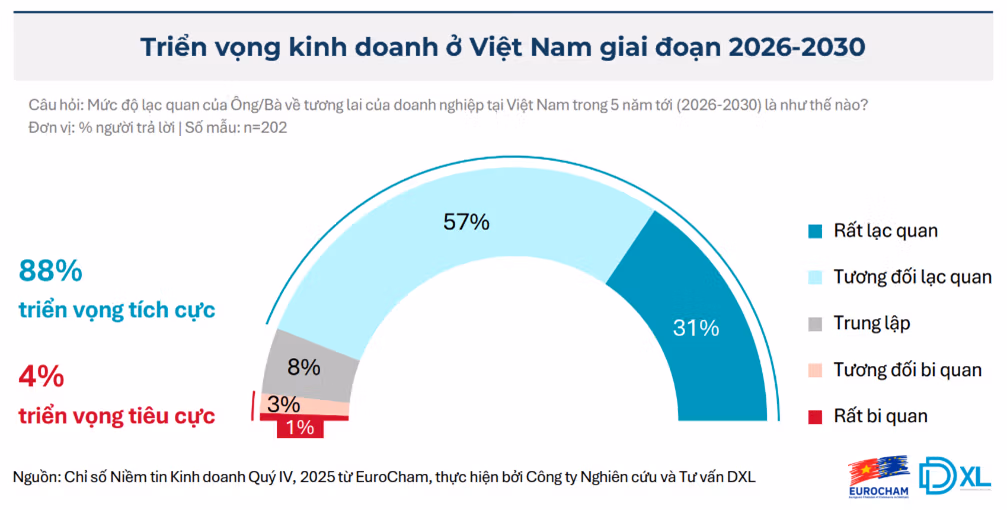 Khảo sát của EuroCham cho thấy 65% doanh nghiệp đánh giá tình hình kinh doanh hiện tại là tích cực, tỷ lệ này dự kiến tăng lên 69% trong quý I/2026. Đáng chú ý, có tới 88% doanh nghiệp bày tỏ sự lạc quan về triển vọng phát triển của Việt Nam trong trung hạn giai đoạn 2026-2030. Theo lãnh đạo EuroCham, nếu tận dụng tốt các cơ hội cải cách và hội nhập, Việt Nam hoàn toàn có thể bước vào một “kỷ nguyên vàng” của tăng trưởng và chuyển đổi kinh tế.