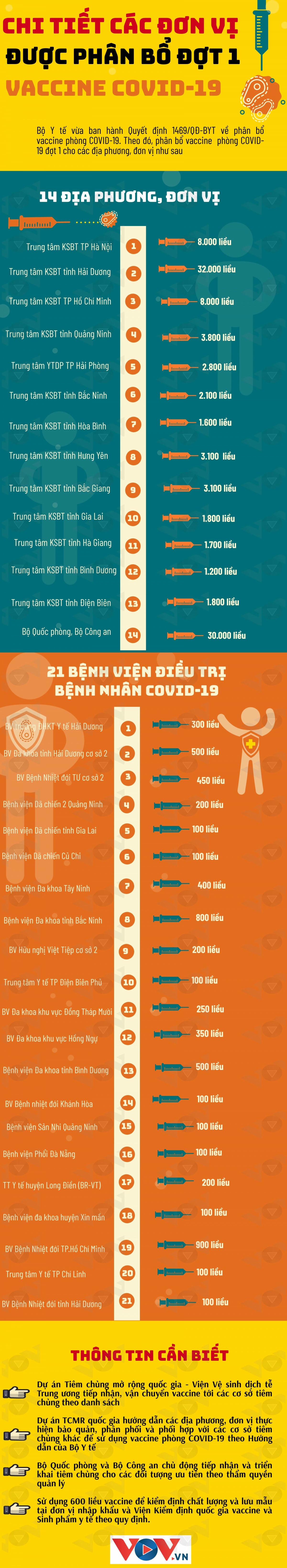 Chi tiết các địa phương, bệnh viện được phân bổ vaccine Covid-19 đợt 1 Chủ Nhật 07/03/2021 14:00 (GMT+7) Bộ Y tế vừa ban hành Quyết định 1469/QĐ-BYT về phân bổ vaccine phòng Covid-19. Theo đó, phân bổ vaccine phòng Covid-19 đợt 1 cho các địa phương, đơn vị như sau