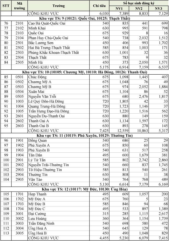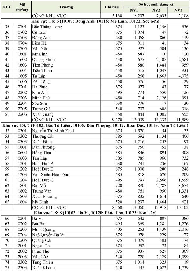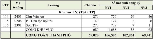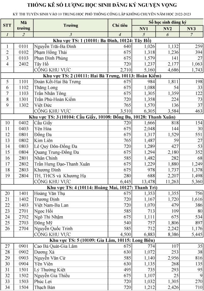 Tổng chỉ tiêu tuyển sinh vào lớp 10 của các trường công lập không chuyên là 69.020 học sinh. Trong đó, Trường THPT Yên Hoà có số lượng hồ sơ đăng ký xét tuyển nguyện vọng 1 cao nhất thành phố (2.048 hồ sơ, chỉ tiêu trúng tuyển 675 học sinh - tỷ lệ 1 chọi 3).