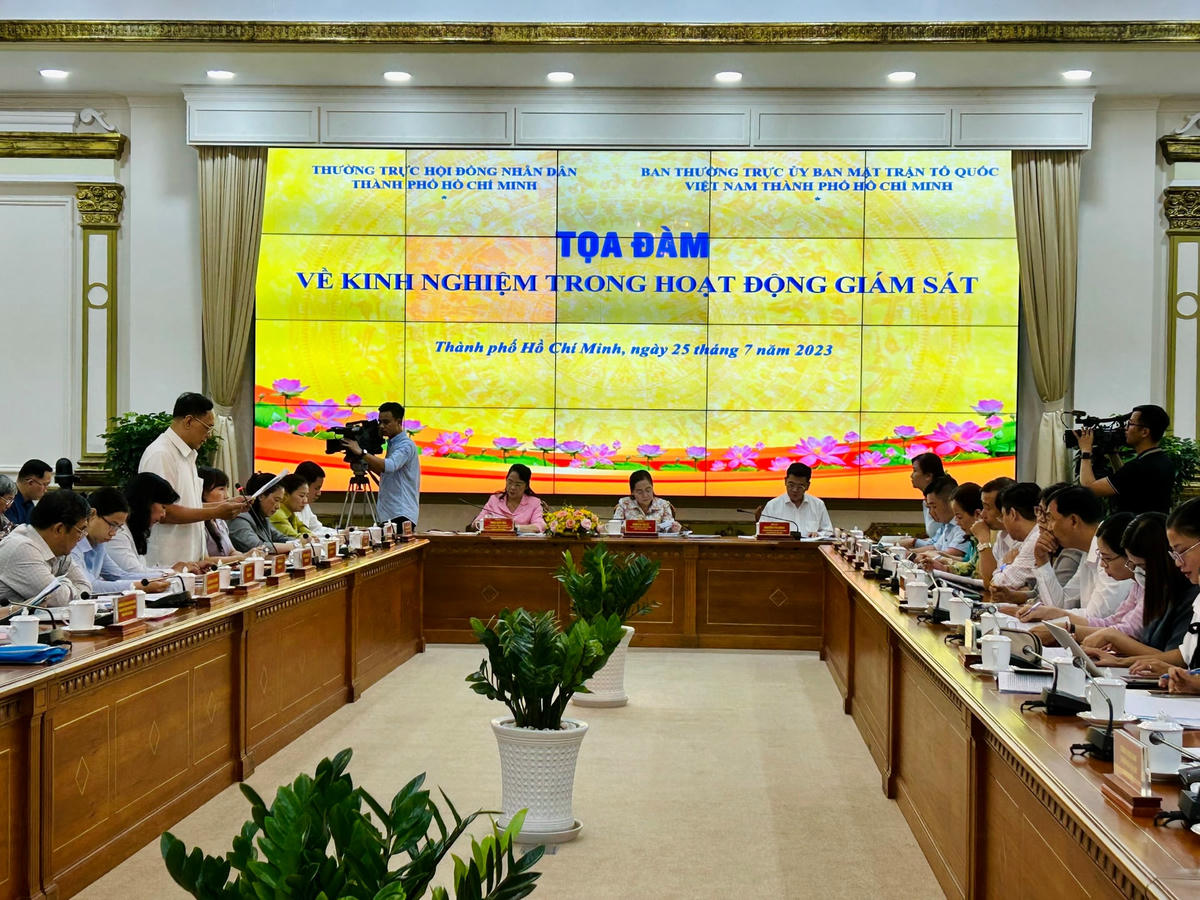 Ngày 25/7, HĐND TP HCM phối hợp với Ủy ban MTTQ Việt Nam TP HCM tổ chức tọa đàm kinh nghiệm trong hoạt động giám sát. Bà Nguyễn Thị Lệ, Chủ tịch HĐND Thành phố; bà Trần Kim Yến, Chủ tịch Ủy ban MTTQ Việt Nam TP HCM; ông Nguyễn Văn Dũng, Phó Chủ tịch HĐND TP HCM chủ trì tọa đàm.