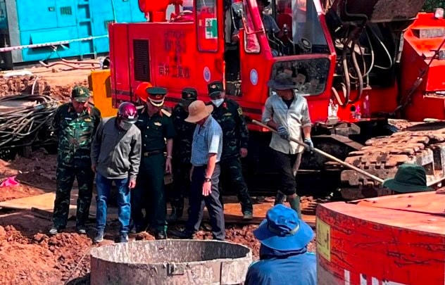 [Lực lượng cứu hộ, cứu nạn tiến hành kiểm tra ống vách thép để tìm cách cứu cháu bé]