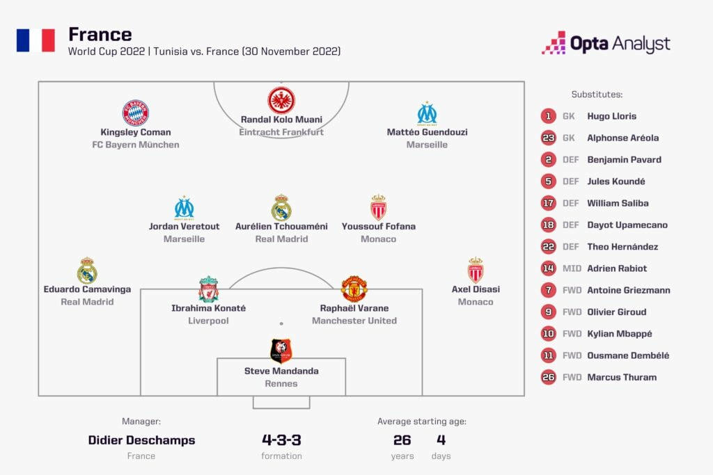 Quyết định của Deschamps giúp tuyển Pháp ghi nhận một số kỷ lục. Hậu vệ Axel Disasi lần đầu tiên ra mắt màu áo Les Bleus, thủ thành Steve Mandanda trở thành cầu thủ lớn tuổi nhất (37 tuổi 247 ngày) từng khoác áo đội tuyển. Và khi William Saliba vào sân từ băng ghế dự bị, Deschamps ghi dấu ấn khi đã tung cầu thủ thứ 24 vào sân thi đấu ở Qatar - lập kỷ lục World Cup.